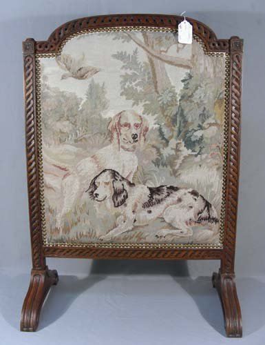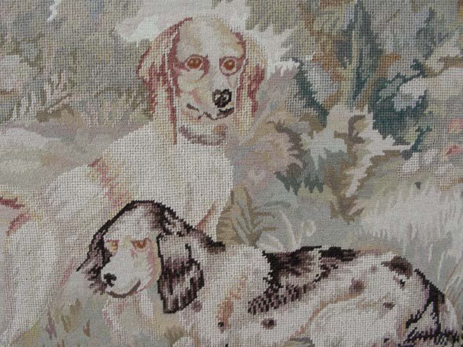 Pettipoint style upholstery with dogs and birds. 36 1/2" high, 26 1/2" wide.