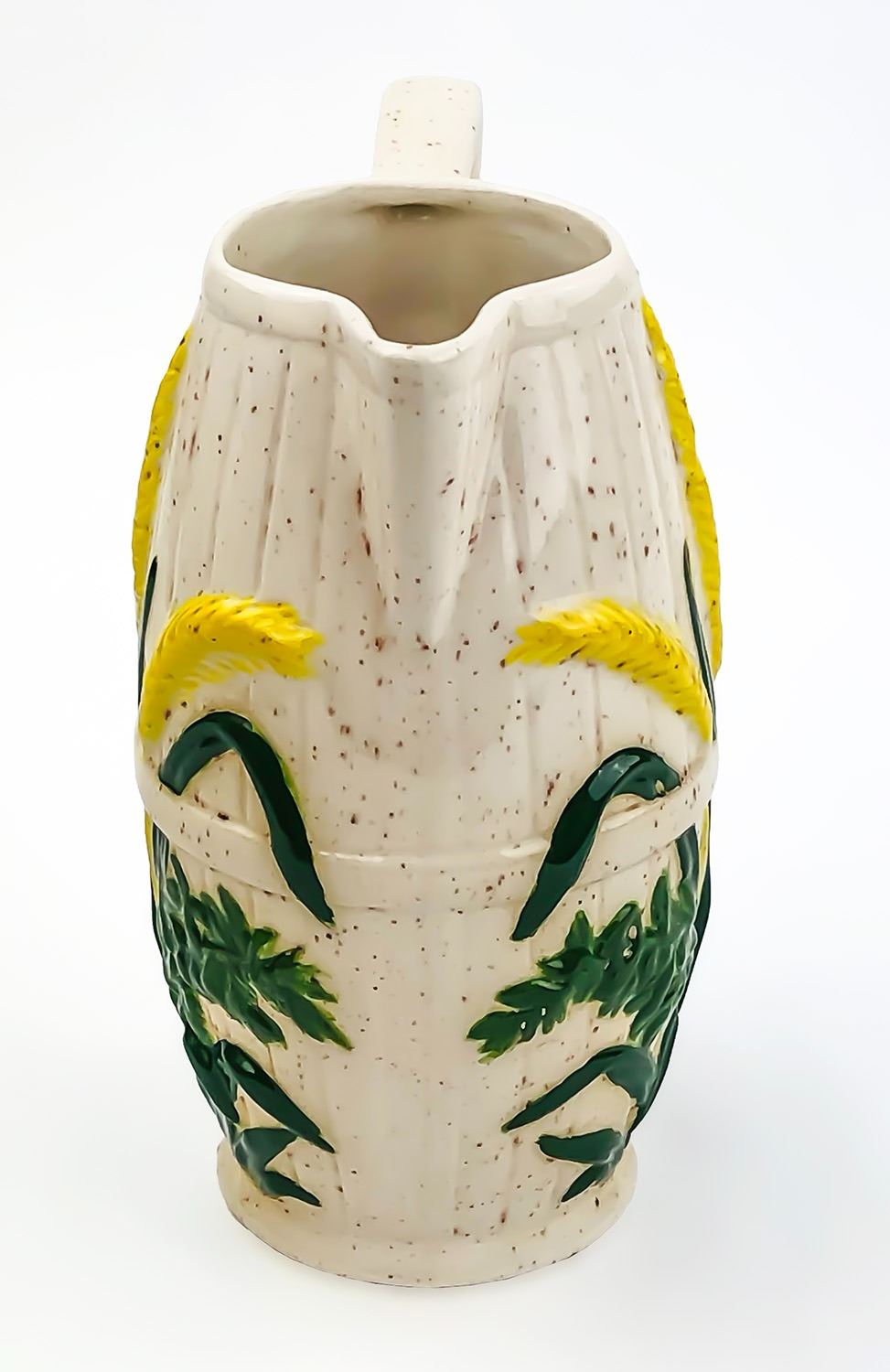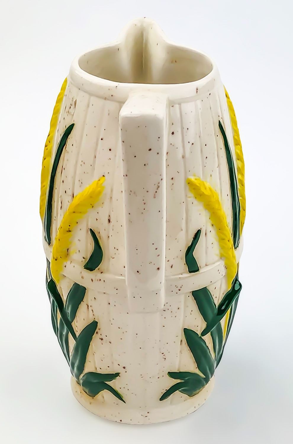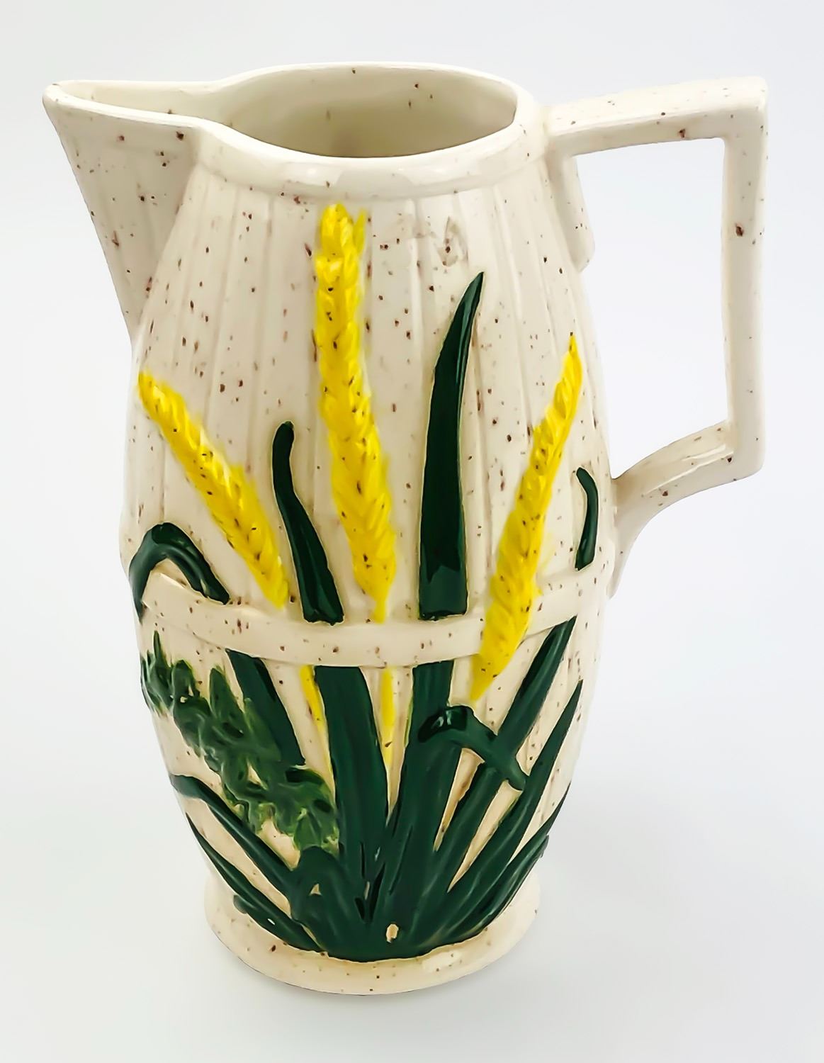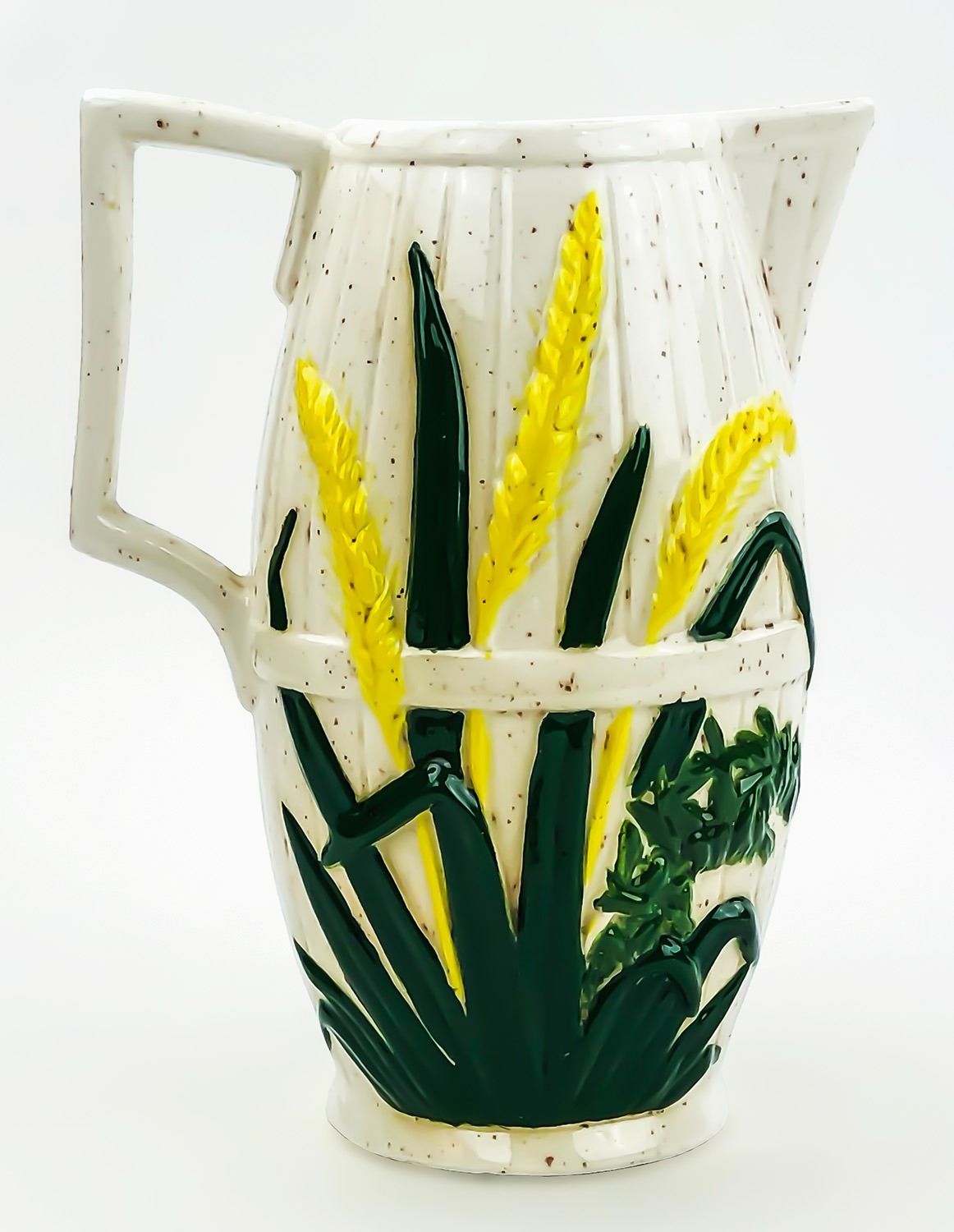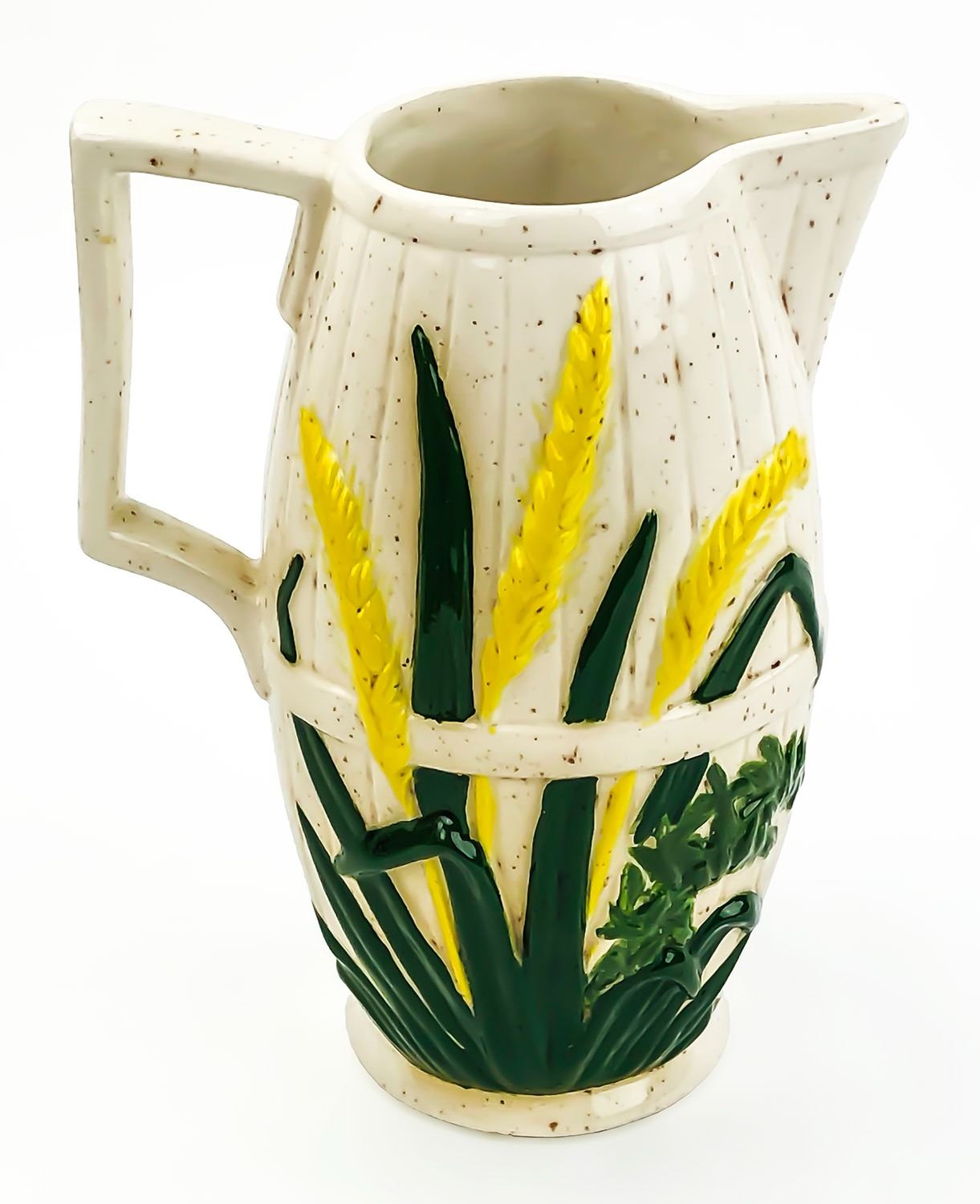 #8358 - WHEAT THEMED COUNTRY PITCHER HOME OR BAR DECOR - SIGNED JC 80 HLB. MEASURES 6.75” (17 CM) TALL, 5.25” (13.5 CM) WIDE - HANDLE TO SPOUT, 3.75” (9.5 CM) WIDEST MIDDLE DIAMETER