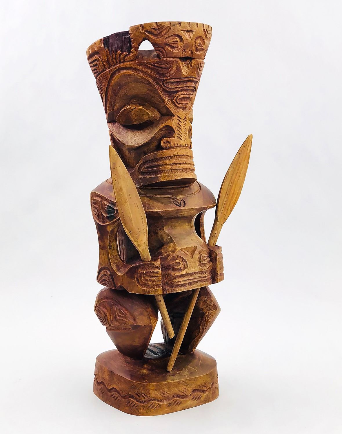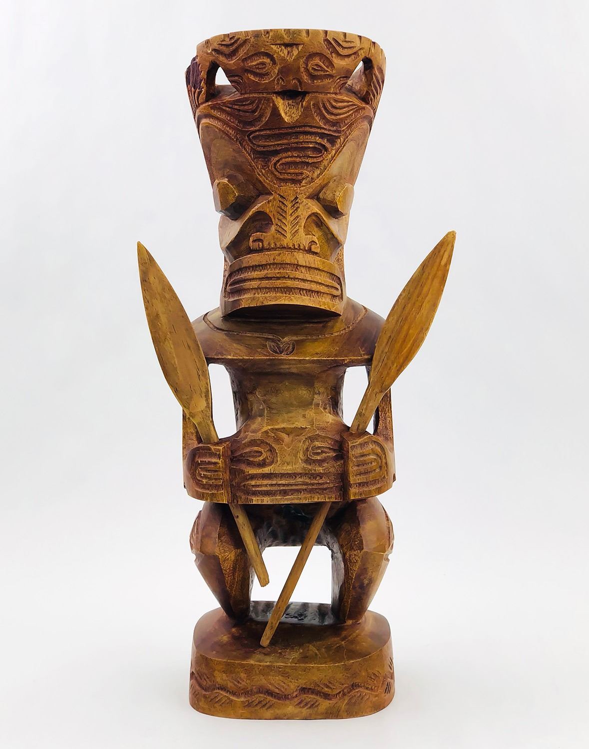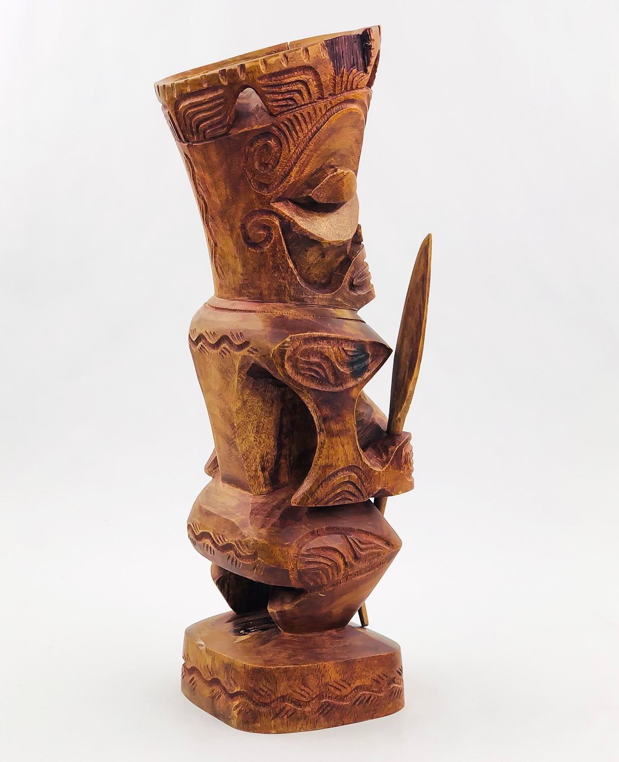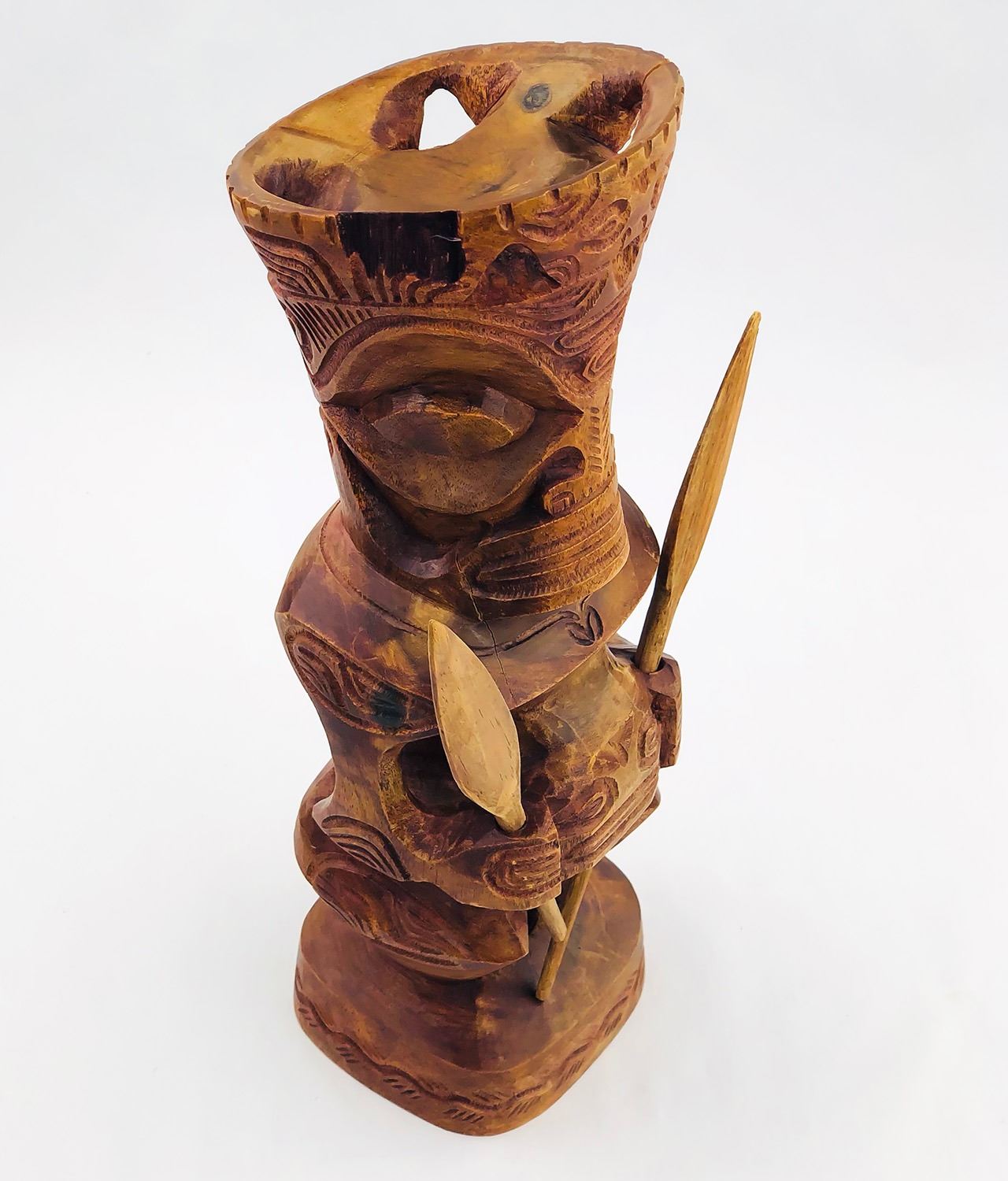 #9009 - HAWAIIAN TIKI HOLDING REMOVABLE SPEARS. NOTE: ONE SPEAR BROKEN/SHORTER THAN THE OTHER, UNSURE OF THE TYPE OF WOOD USED. MEASURES 13.5” (34 CM) TALL BY ROUGHLY 4.25” (11 CM) WIDTH, 4” (10 CM) DEPTH***ITEM(S) LOCATED IN LETHBRIDGE ALBERTA. ALL ITEMS IN THIS AUCTION QUALIFY FOR OUR FREE TRANSPORT TO EDMONTON SERVICE. WORLDWIDE SHIPPING AVAILABLE