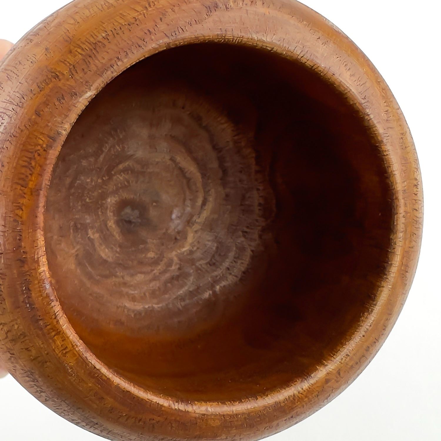 #8556 - VINTAGE HAND TURNED WOODEN MORTAR AND PESTLE. UNSIGNED RUSTIC LOOKING KITCHEN CRUSHING GRINDING APPLIANCE. MEASURES: 4.5” (11.5 CM) DIAMETER BY 4.5” (11.5 CM) TALL AND PESTLE IS 5.5” (14 CM) LONG AND 1.25” (3 CM) DIAMETER