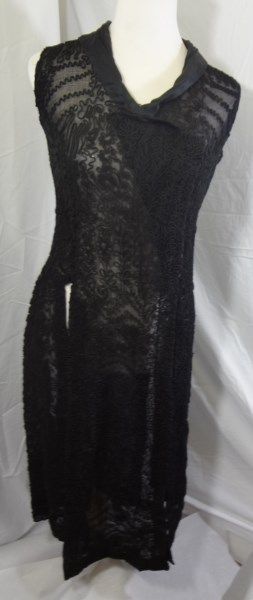VINTAGE HAND MADE LADIES DRESS OVERLAY. THE WHOLE OVERLAY HAS EMBROIDERY SEWN ON. tHERE IS A SATIN COLLAR AND THE FRONT SNAPS SHUT. THERE IS WEAR AND SOME OF THE STITCHING IS COMING UNDONE.