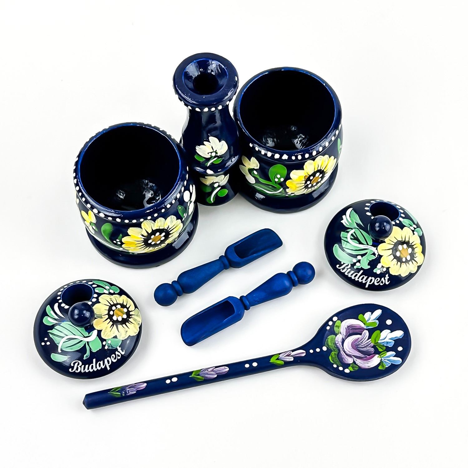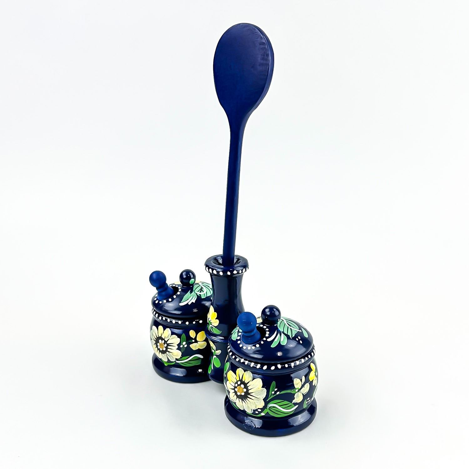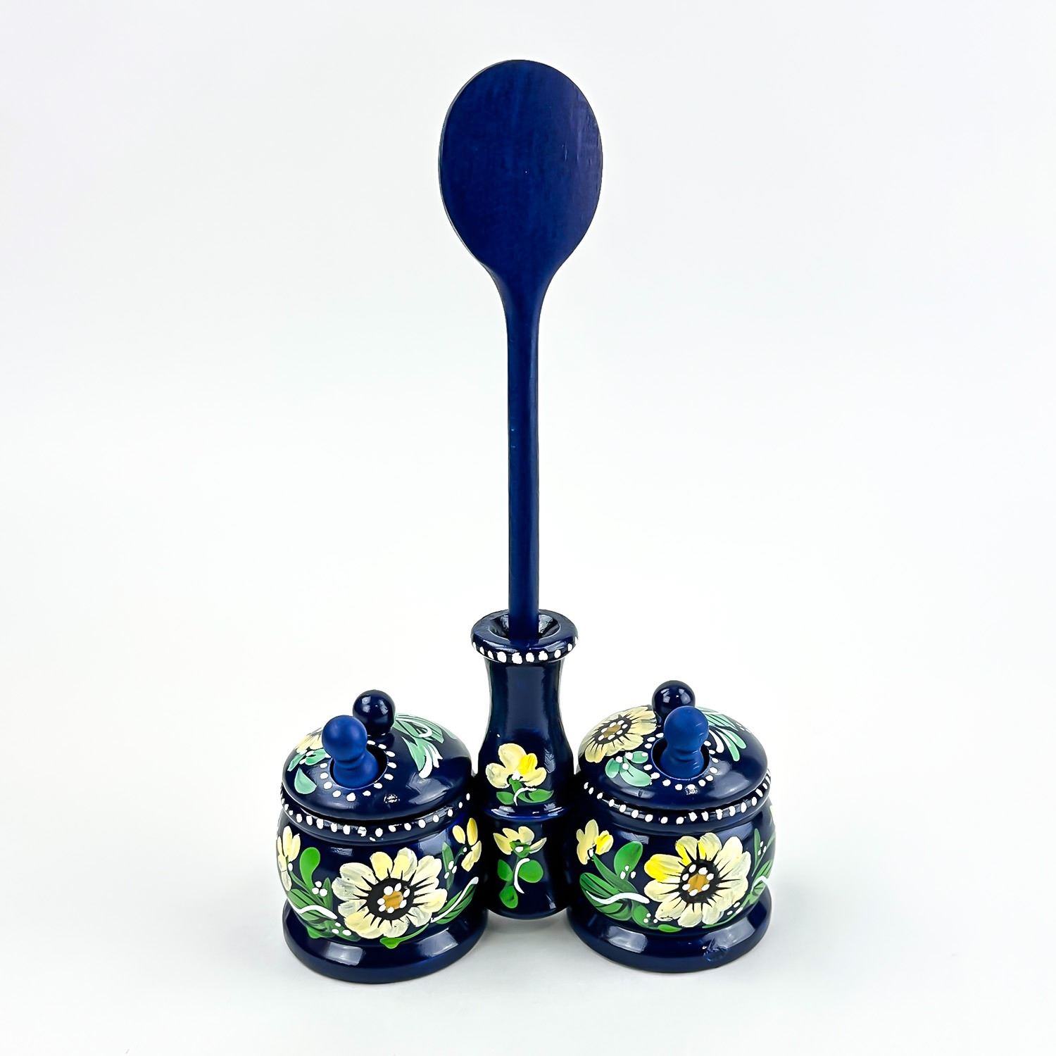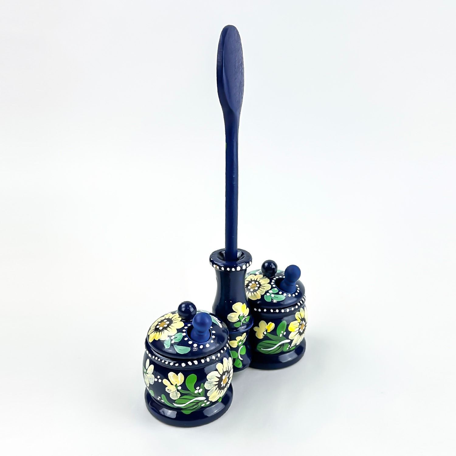 #8539 - VINTAGE HAND CRAFTED WOODEN 6 PIECE SPICE JAR SET - SPOON SCOOPS LIDS ETC. NICE FOLK ART PIECE FOR THE KITCHEN OR JUST FOR HOME DECOR. MEASURES 9” (23 CM) TALL BY 5.5” (14 CM) WIDE AND 2 3/8” (6 CM) DEEP.
