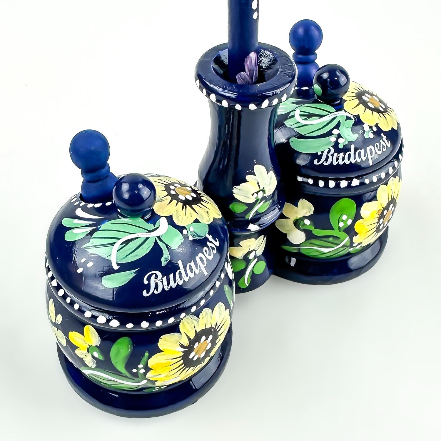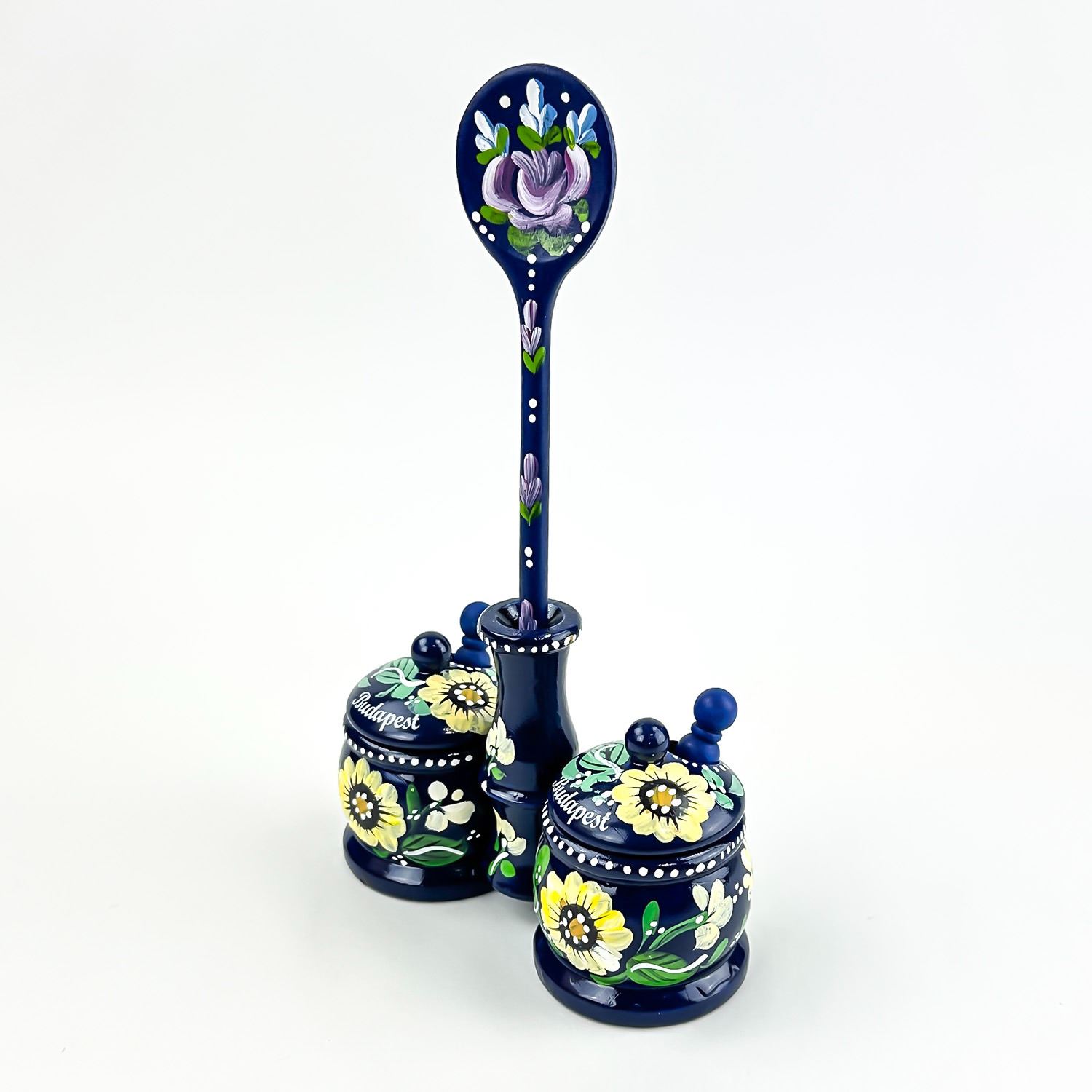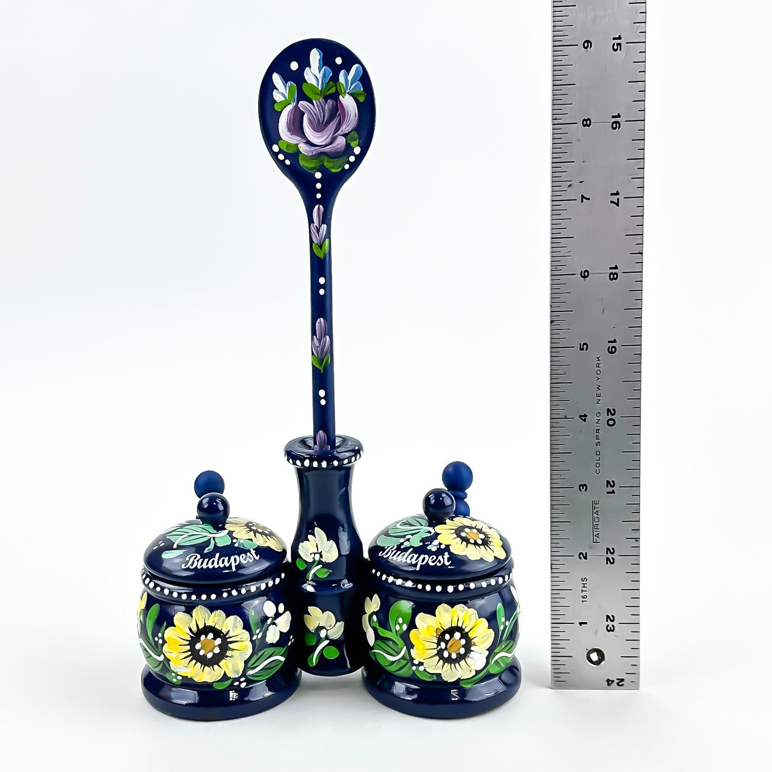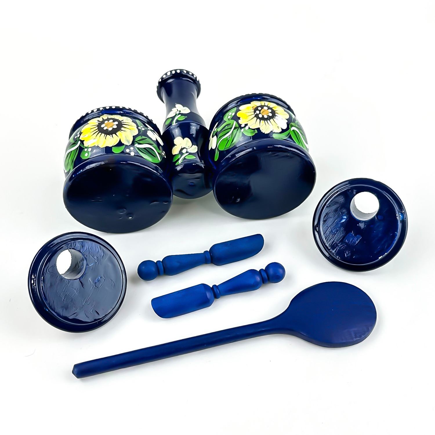 #8539 - VINTAGE HAND CRAFTED WOODEN 6 PIECE SPICE JAR SET - SPOON SCOOPS LIDS ETC. NICE FOLK ART PIECE FOR THE KITCHEN OR JUST FOR HOME DECOR. MEASURES 9” (23 CM) TALL BY 5.5” (14 CM) WIDE AND 2 3/8” (6 CM) DEEP.