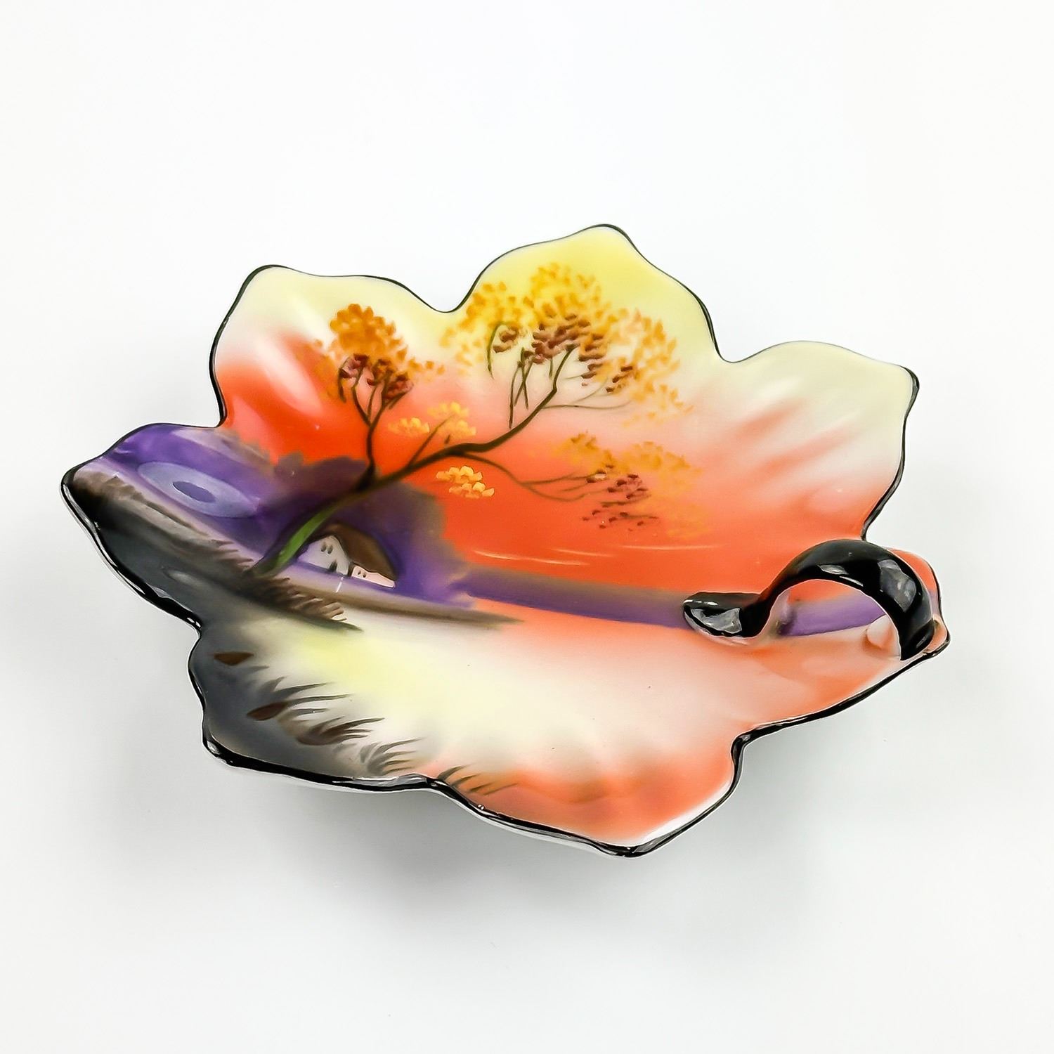 #8662 - PORCELAIN NORITAKE FLOWER PETAL SHAPED PLATE, TRINKET OR JEWELRY DISH WITH HANDLE. HOUSE OR CABIN BY THE WATER AND SURROUNDED BY TREES PAINTING. RED NORITAKE “M’ IN WREATH HAND PAINTED - MADE IN JAPAN BACK STAMP MARK. HOME DECOR ART POTTERY TRAY. MEASURES: 6” (15 CM) DIAMETER