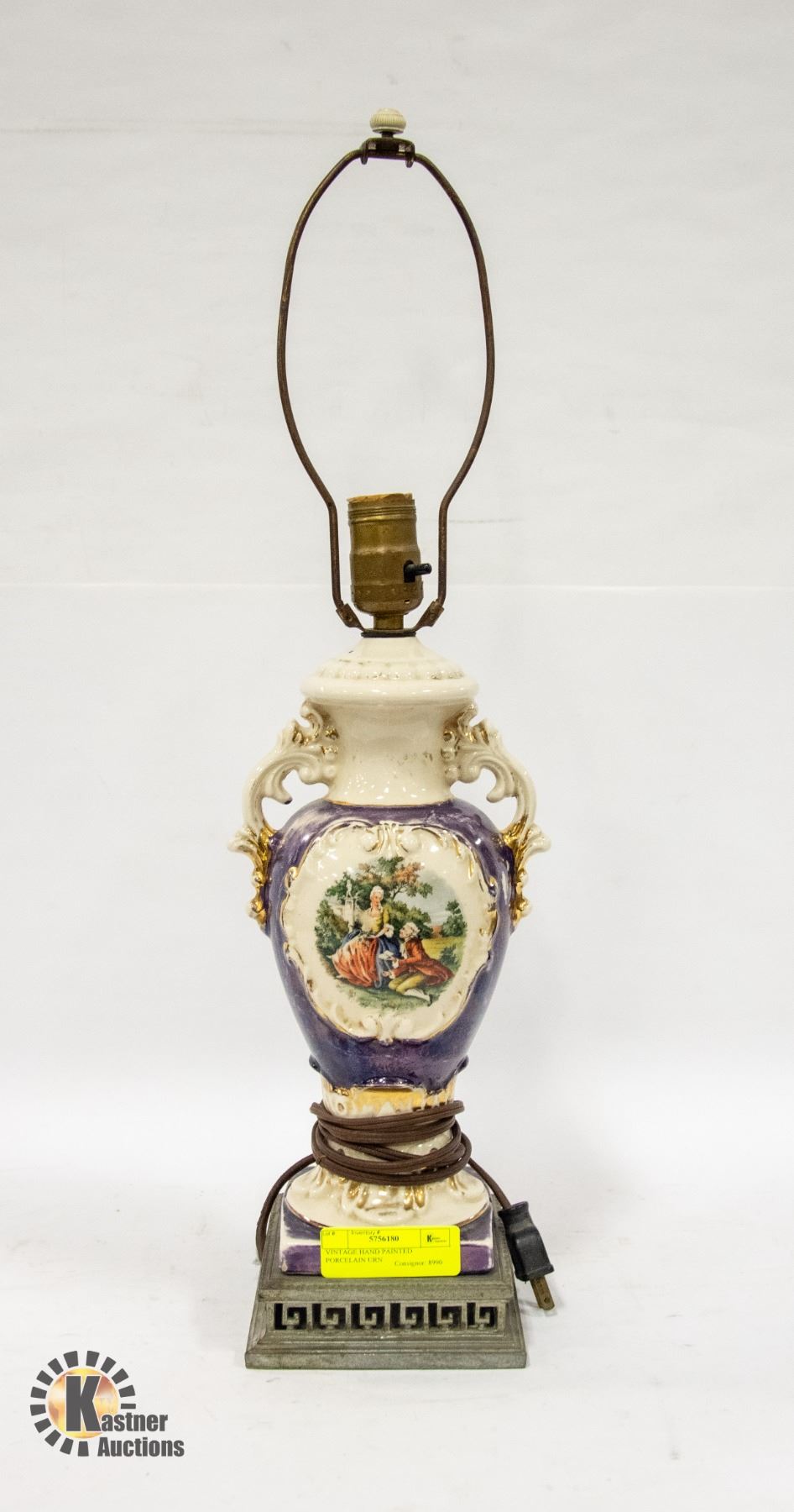 LAMP 17" TALL GILDED PURPLE DEPICTING COUPLE IN GARDEN **ALL ITEMS MUST BE REMOVED BY 5PM SATURDAY, FEBRUARY 10TH 2024. ALL REMAINING ITEMS WILL BE SUBJECT TO A $6.00 PER DAY STORAGE CHARGE. ANY ITEMS REMAINING AFTER MONDAY, FEBRUARY 26TH, 2023 WILL BE CONSIDERED FORFEITED. NO REFUNDS WILL BE ISSUED FOR FORFEITED ITEMS. TO SCHEDULE A PICK UP APPOINTMENT CLICK HERE