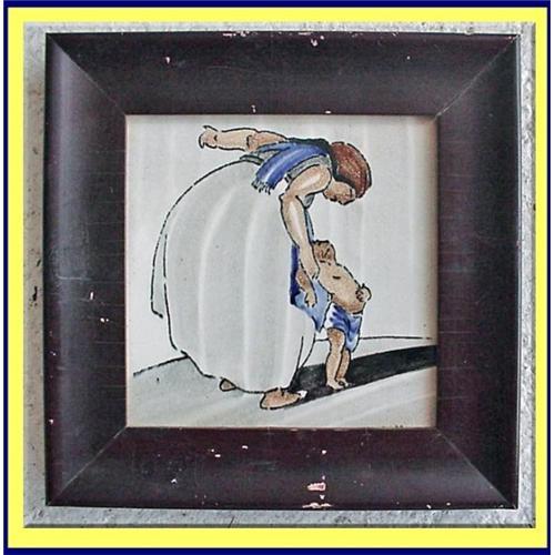A vintage handpainted tile depicting a mother leaning over and holding the arm of a small child. Date and origin not known, but has a Modern simplistic look with a few lines and subtle colouring conveying a great deal. Very pleasing scene. Strong Arts and Crafts feel to the painting. Tile (excluding frame) Measures 5 1/2 X 5 1/2 inches. The frame looks a lot older than the tile and might have been used to mislead as the back of the tile has been covered by brown paper.