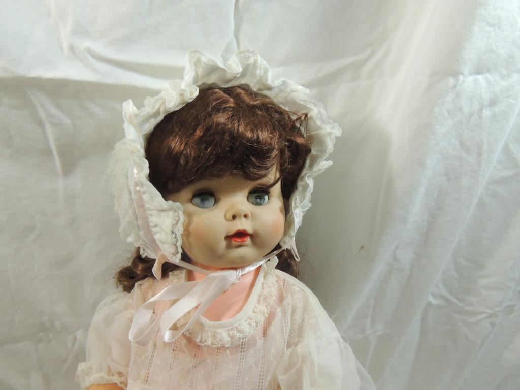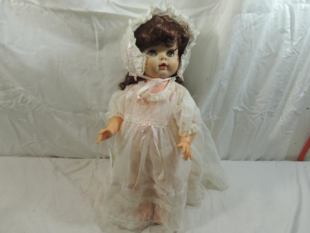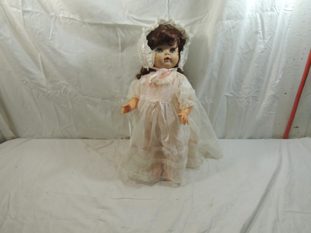 COLLECTIBLE DOLL, PLASTIC DOLL, SLEEP EYES, BROWN HAIR, VINTAGE DRESS, DECORATIVE DOLL, COLLECTORS DOLL AS SHOWN SEE PHOTO FOR MORE DETAILS.