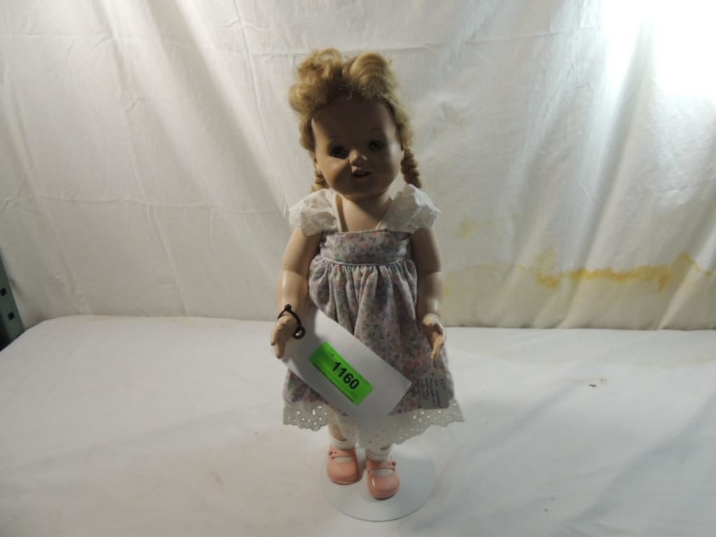 CUTE UNMARKED HARD PLASTIC DOLL WALKING DOLL, BLONDE HAIR, ON STAND FLORAL DRESS, AS SHOWN SEE PHOTO FOR MORE DETAILS.