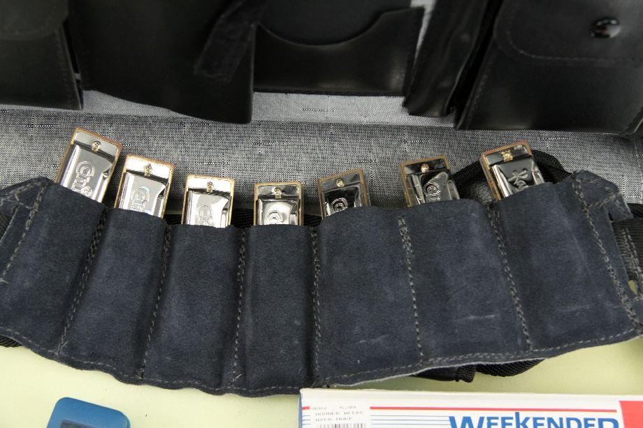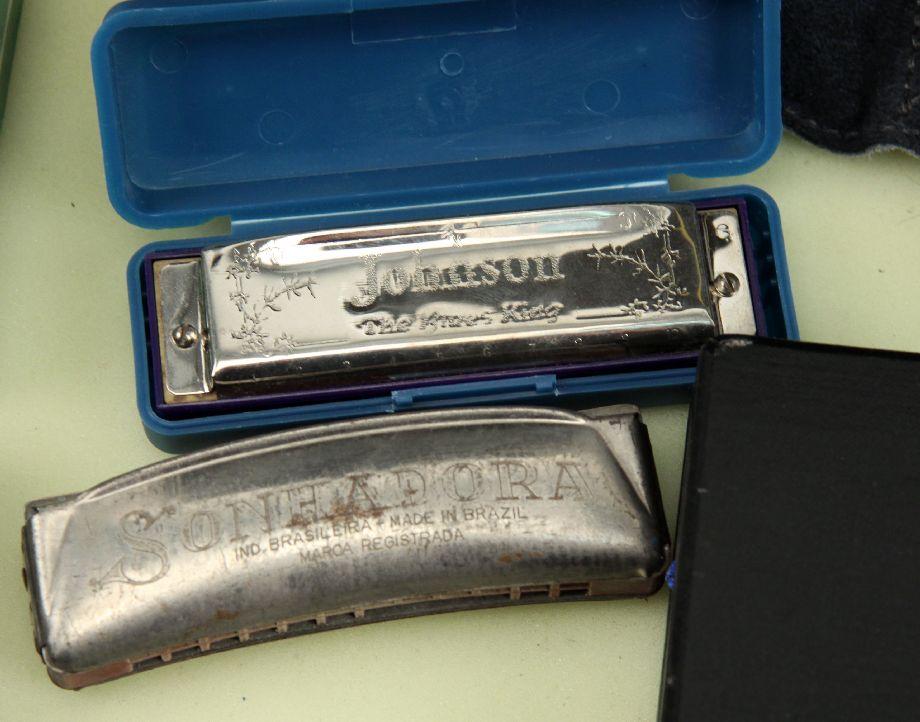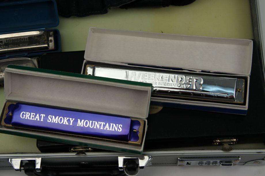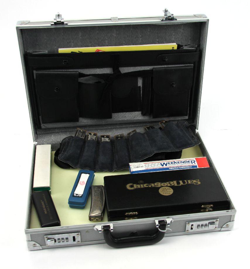 Lot includes: 7 Chicago Blues 25th anniversary edition harmonicas with original box and felt carrying strap, 1 Mojo Music Deluxe with case, 1 Johnson The Blues King with case, 1 Weekender Hohner International with case, 1 Great Smoky Mountains with case and 1 Sonhadora. Instructional booklets and storage case also included.