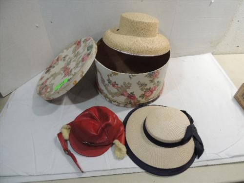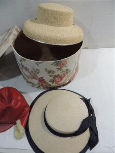 VINTAGE HAT BOX & 2 LADY HATS & CHILD'S WINTER HAT. AS SHOWN. VIEW PICTURE FOR DETAIL.