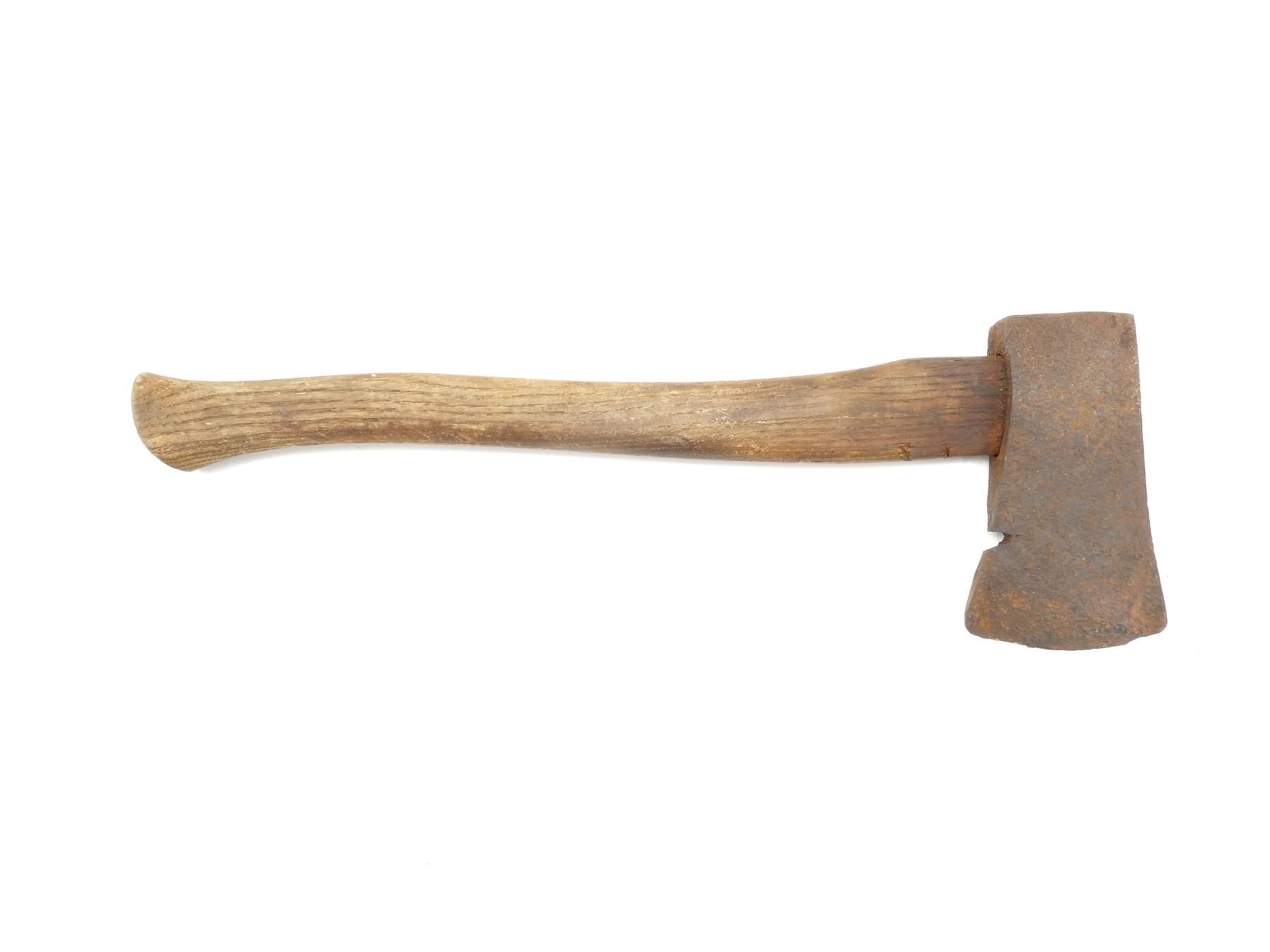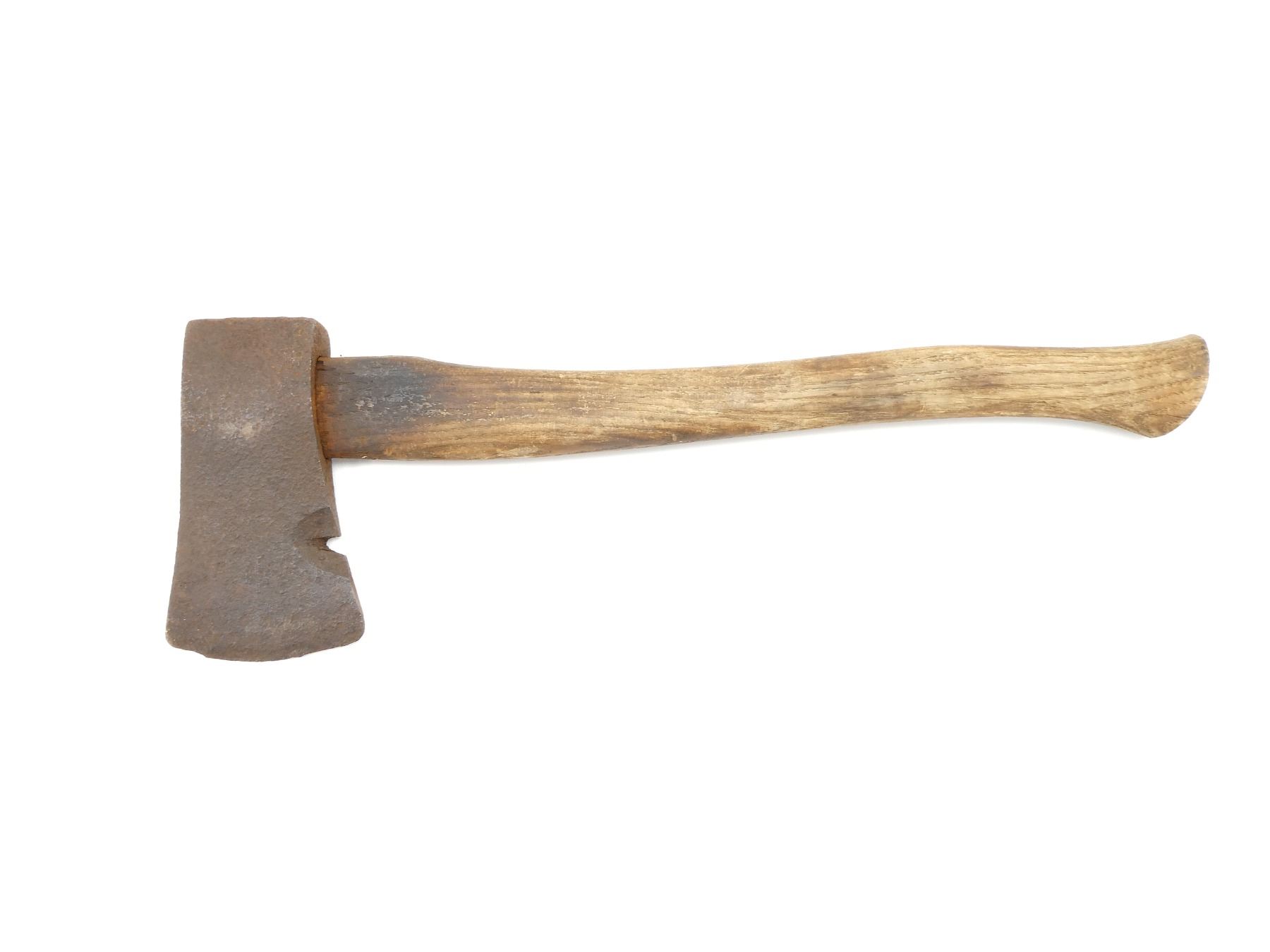(1) HATCHET, METAL HEAD, PITTED, WITH NAIL PULLER, WOOD HANDLE, HEAD APPROX. 5.25" & OAL APPROX. 15.5". SEE PHOTOS.