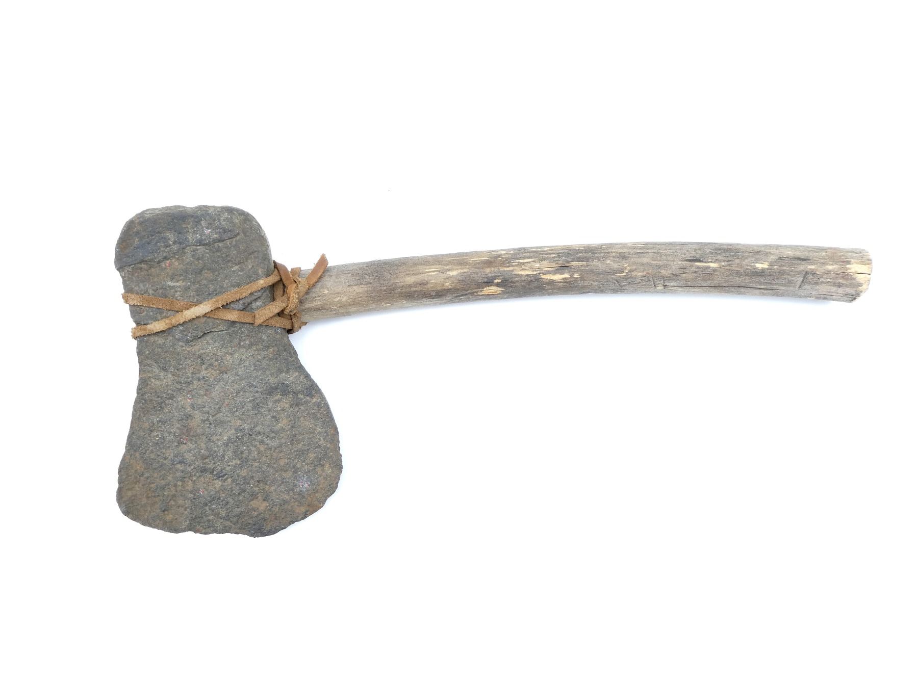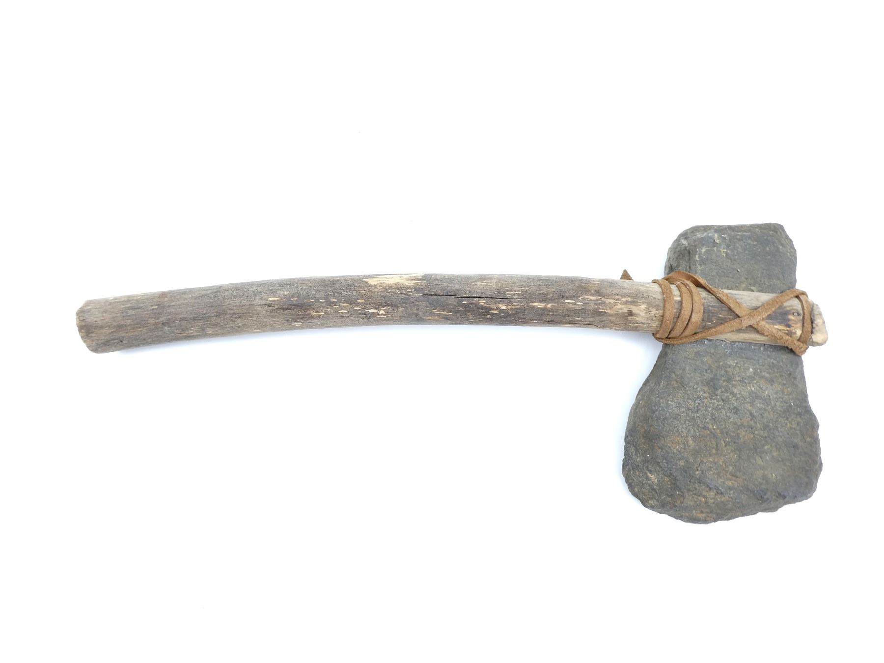(1) HATCHET, STONE HEAD, WOOD HANDLE, HEAD APPROX. 6.25" & OAL APPROX. 14.25". SEE PHOTOS.