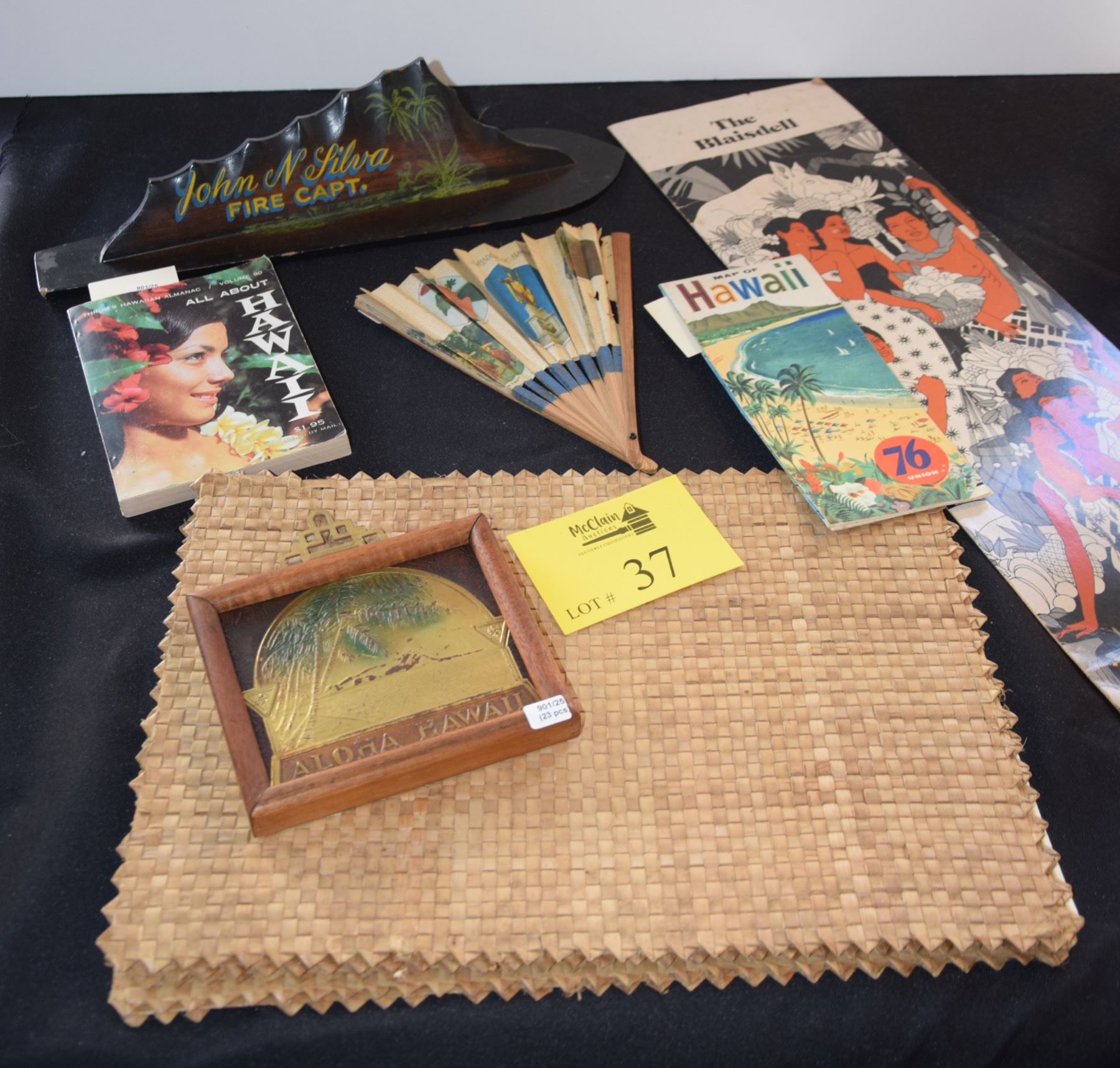 VINTAGE HAWAIIAN COLLECTIBLES, MAP, MENU, BOOK, FAN, WOVEN PLACEMATS, DIAMOND HEAD SIGN & KOA FRAMED