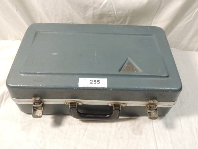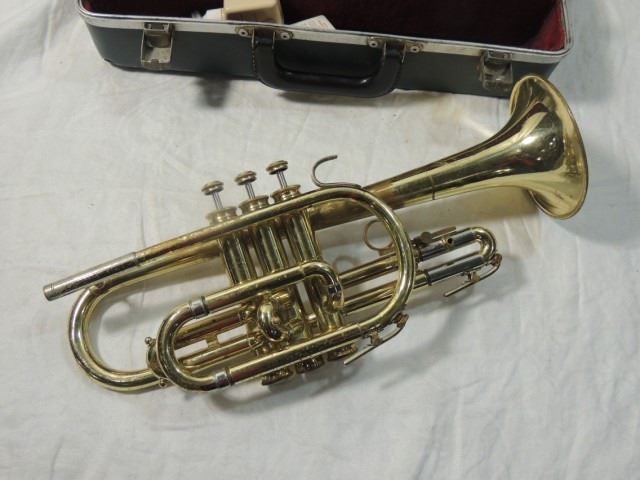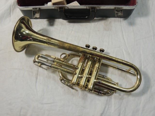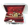 SOME BUMPS AND BRUISES, DENTS, ETC. BUT ALL VALVES WORK WELL, PLAYS WELL, COMPLETE WITH MOUTHPIECE, CASE, ETC. AS SHOWN.