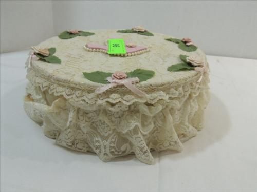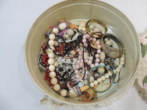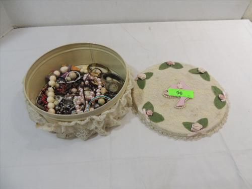 VINTAGE HOME DECORATED TIN WITH LADY'S COSTUME JEWELRY INSIDE. AS SHOWN. VIEW PICTURE FOR DETAIL.