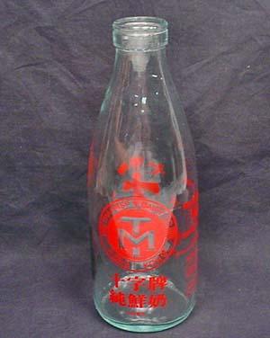 VINTAGE HONG KONG TRAPPIST DAIRY GLASS ADVERTISING MILK BOTTLE - Approx. 8.5" tall.