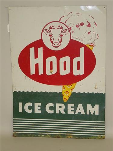 VINTAGE HOOD ICE CREAM TIN ADVERTISING SIGN W/ CONE & COW (28" X 20")