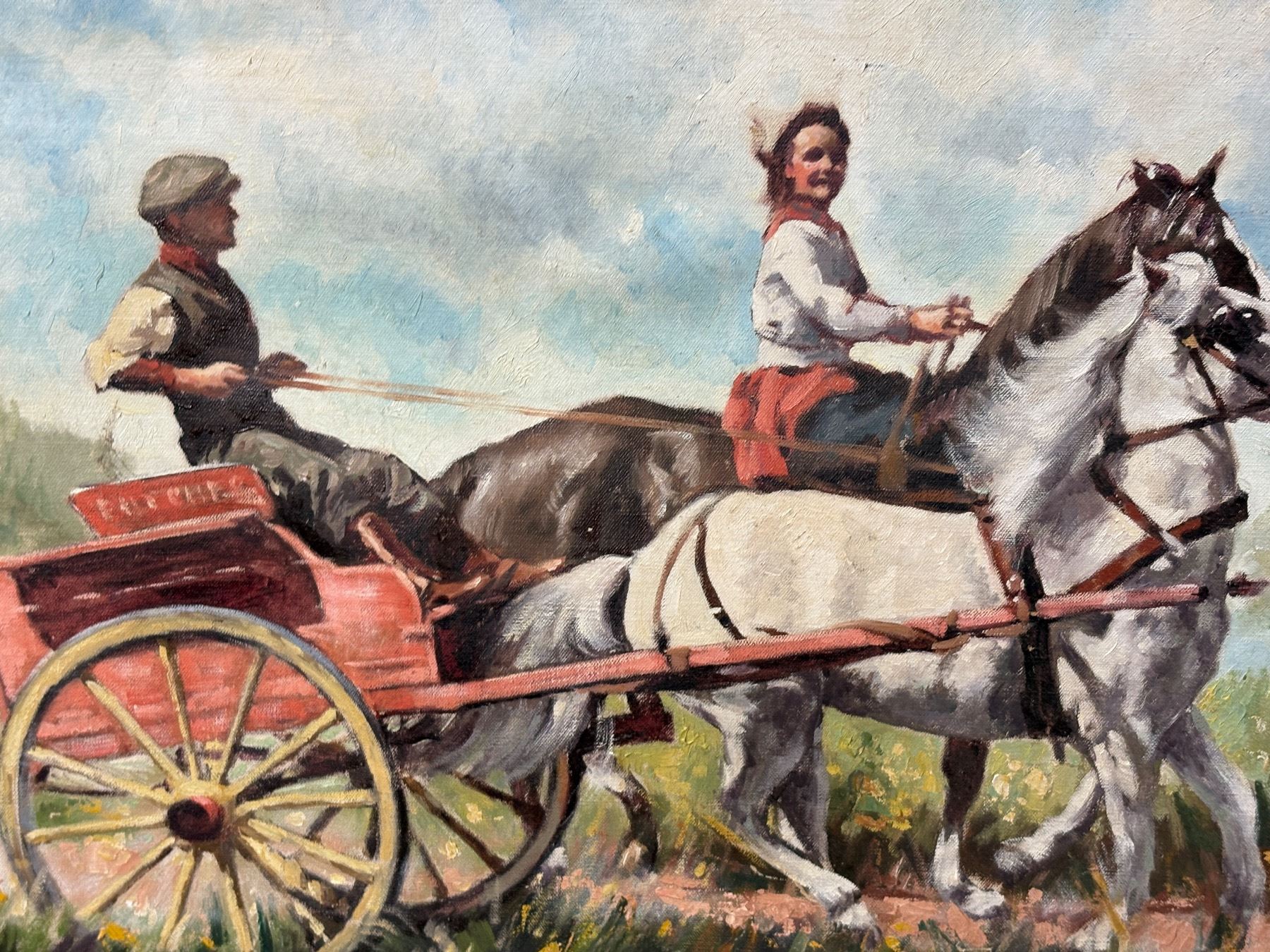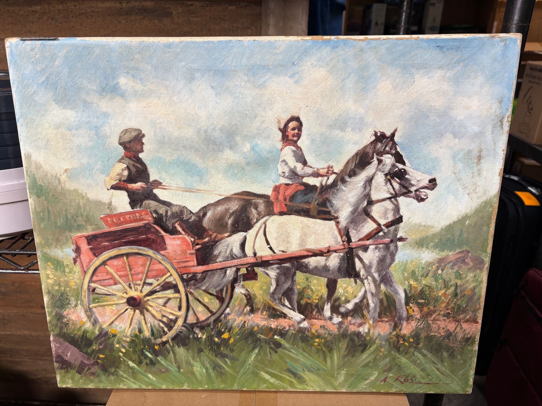 VINTAGE "HORSE CARRIAGE" FRAMED PAINTING SIGNED BY ARTIST ON CANVAS 20IN X 16IN