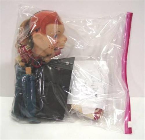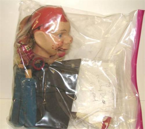 VINTAGE HOWDY DOODY MARIONETTE. Has plastic head and cloth clothing with boots. Shows damage to face at mandible. 14" H