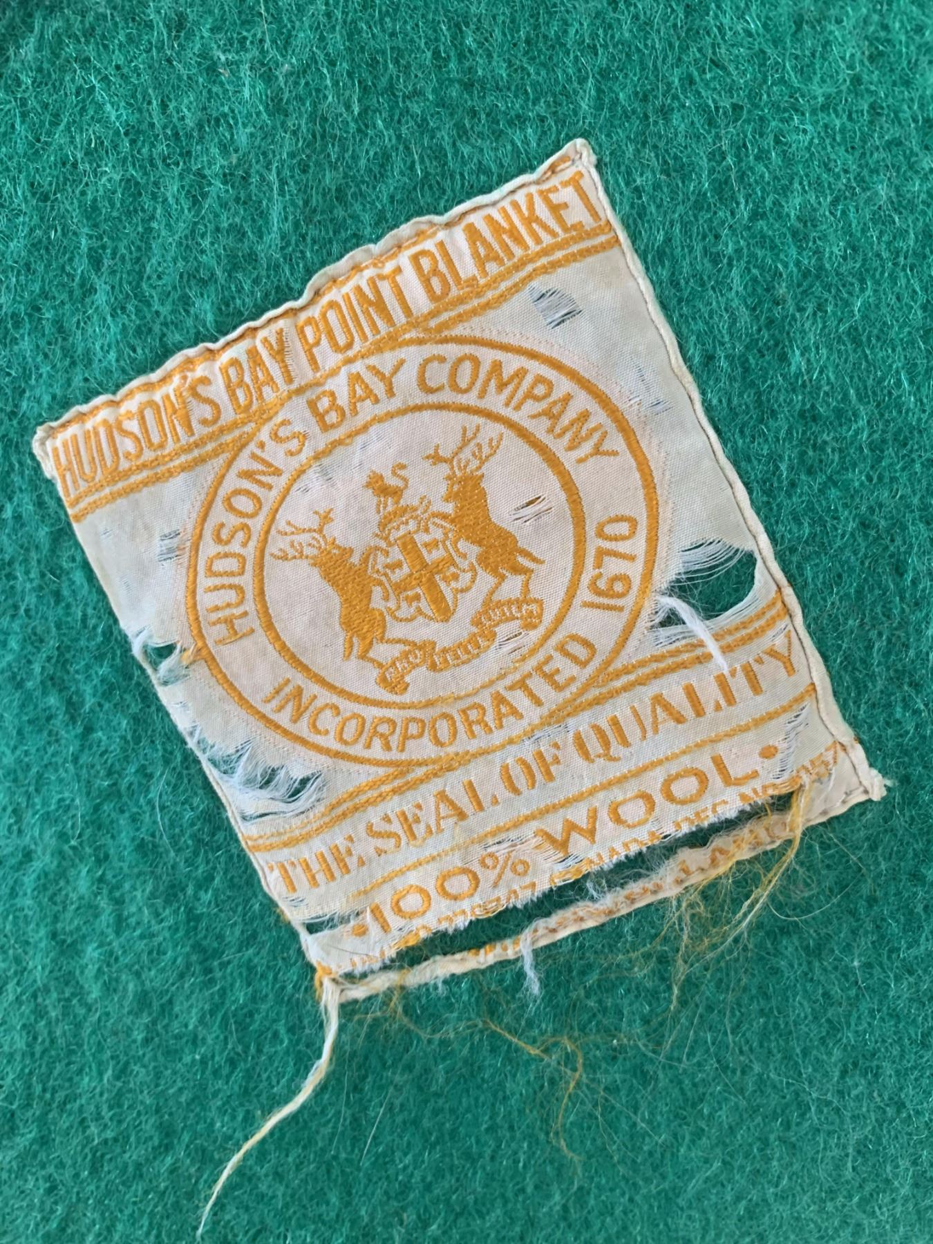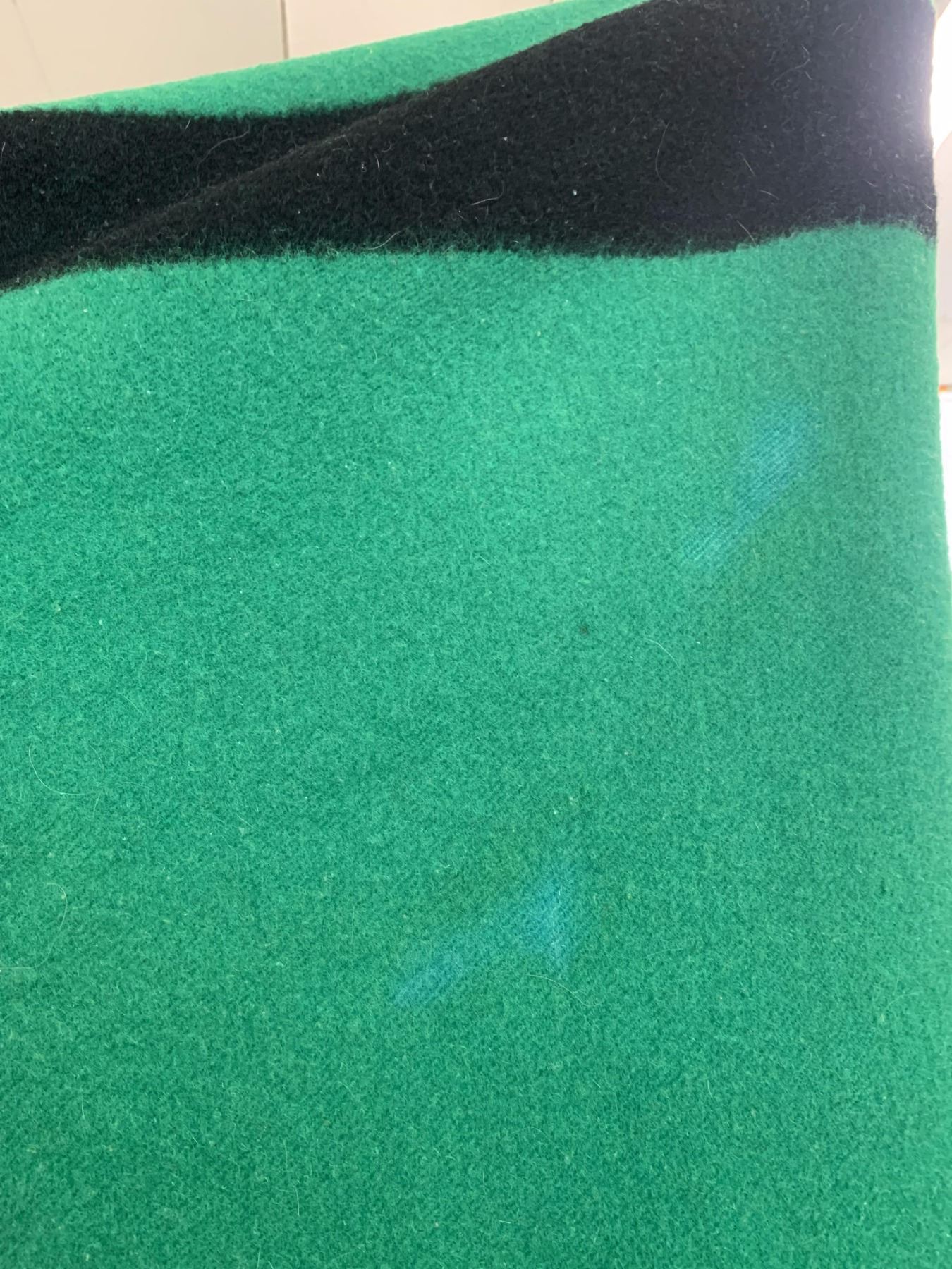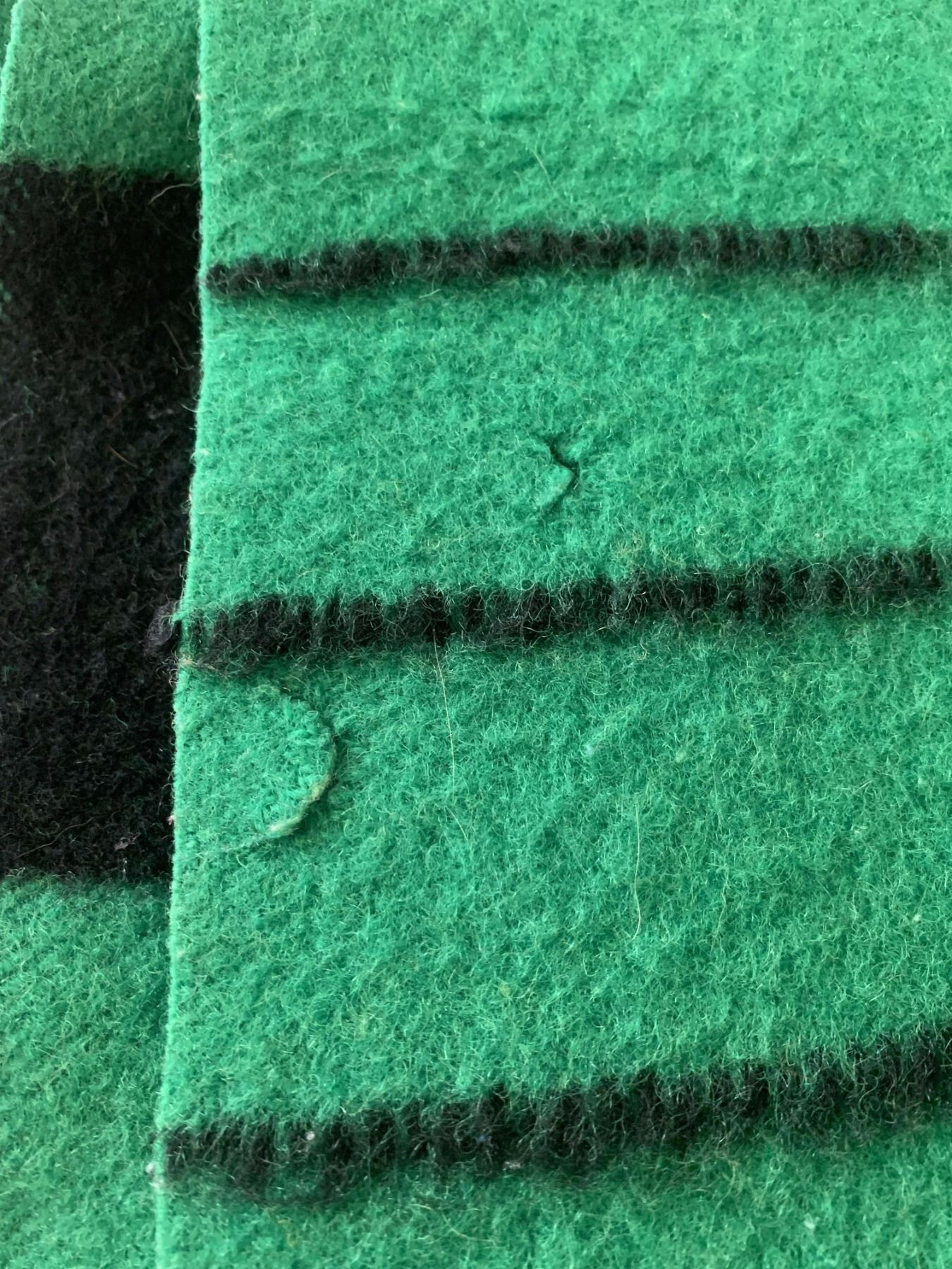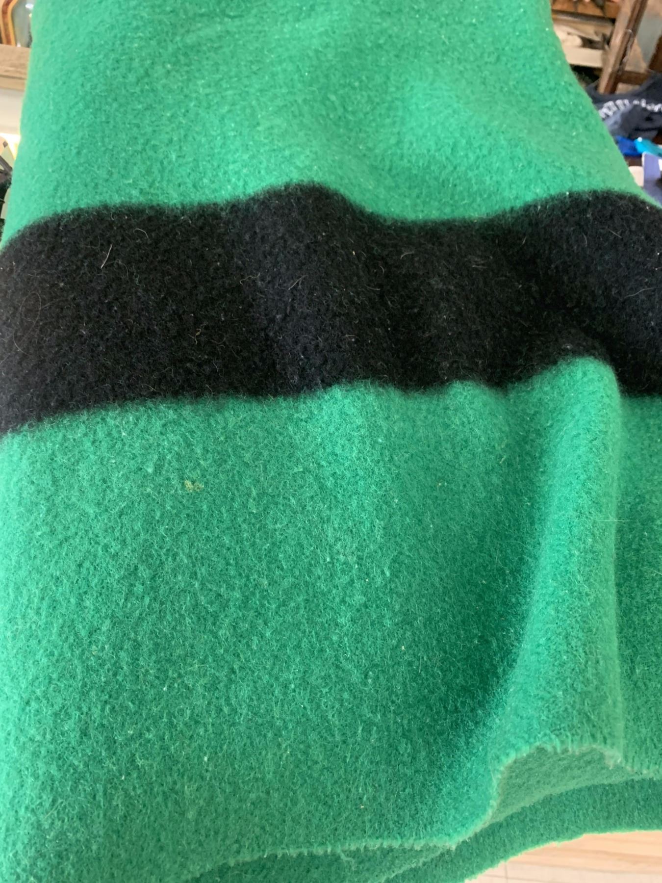 VINTAGE HUDSONS BAY COMPANY 4 POINT GREEN WOOL BLANKET (minor wear and tear, staining etc.)