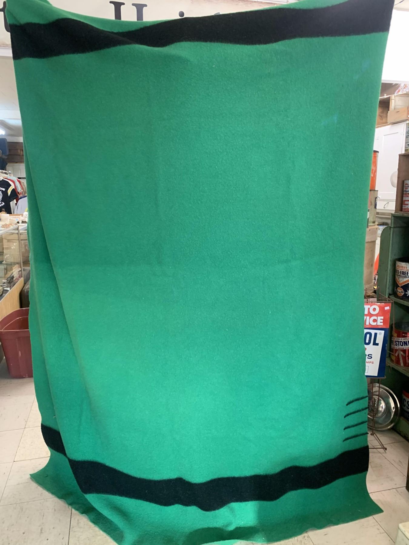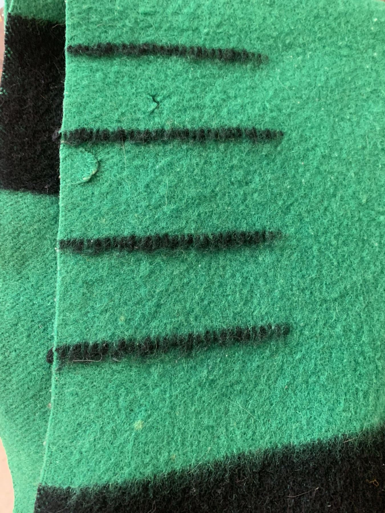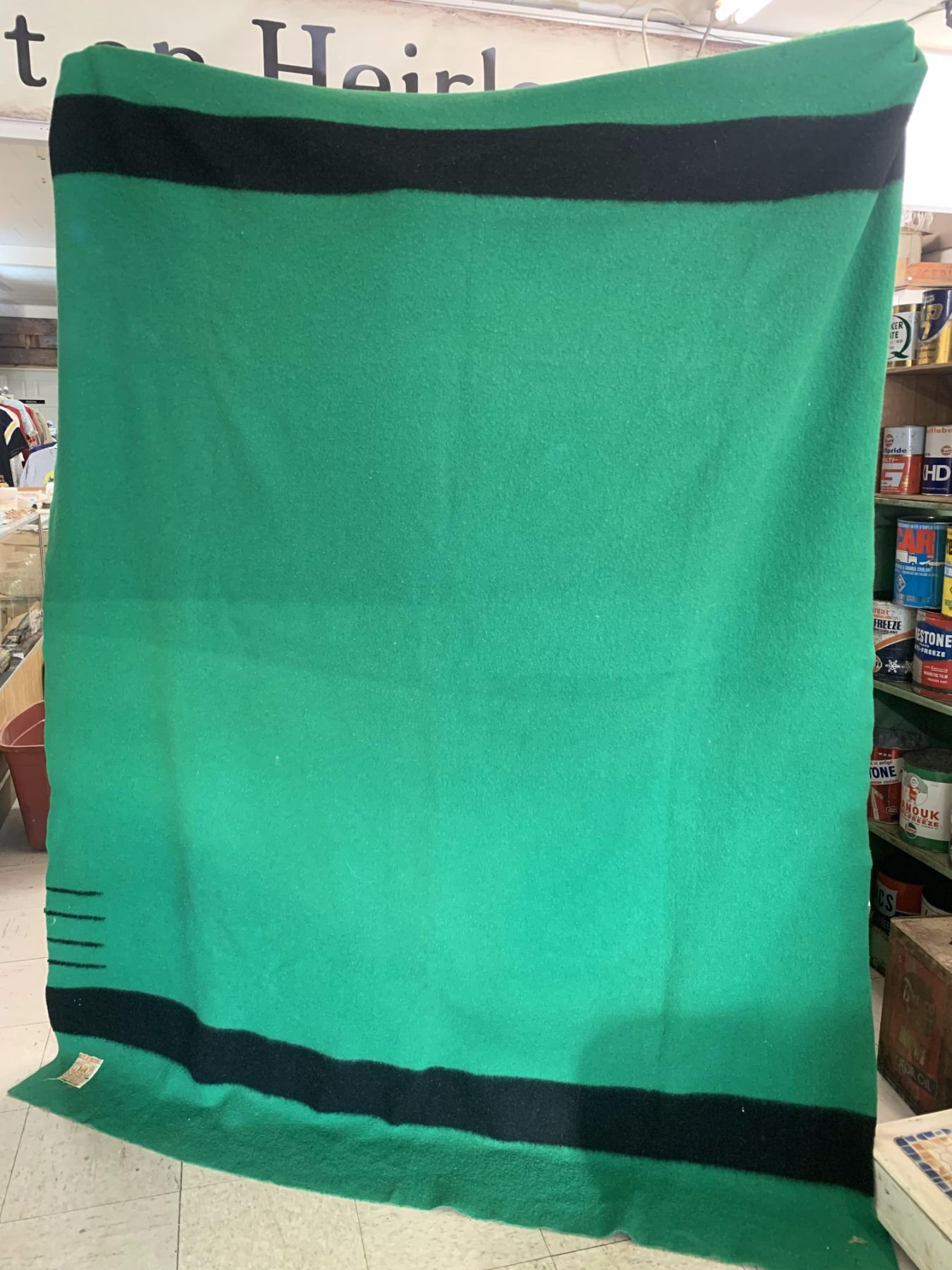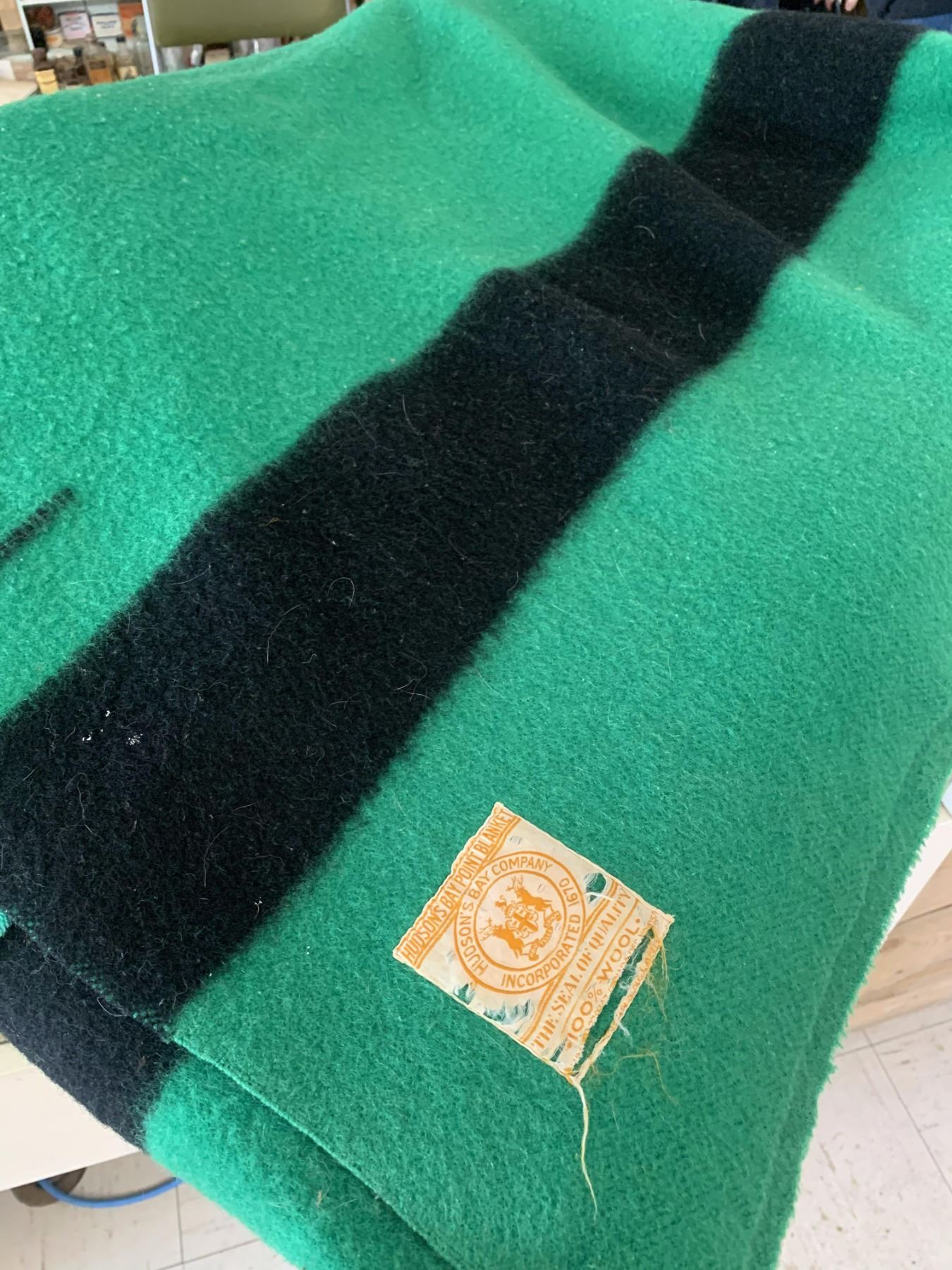 VINTAGE HUDSONS BAY COMPANY 4 POINT GREEN WOOL BLANKET (minor wear and tear, staining etc.)