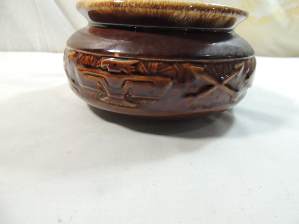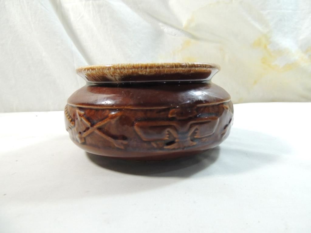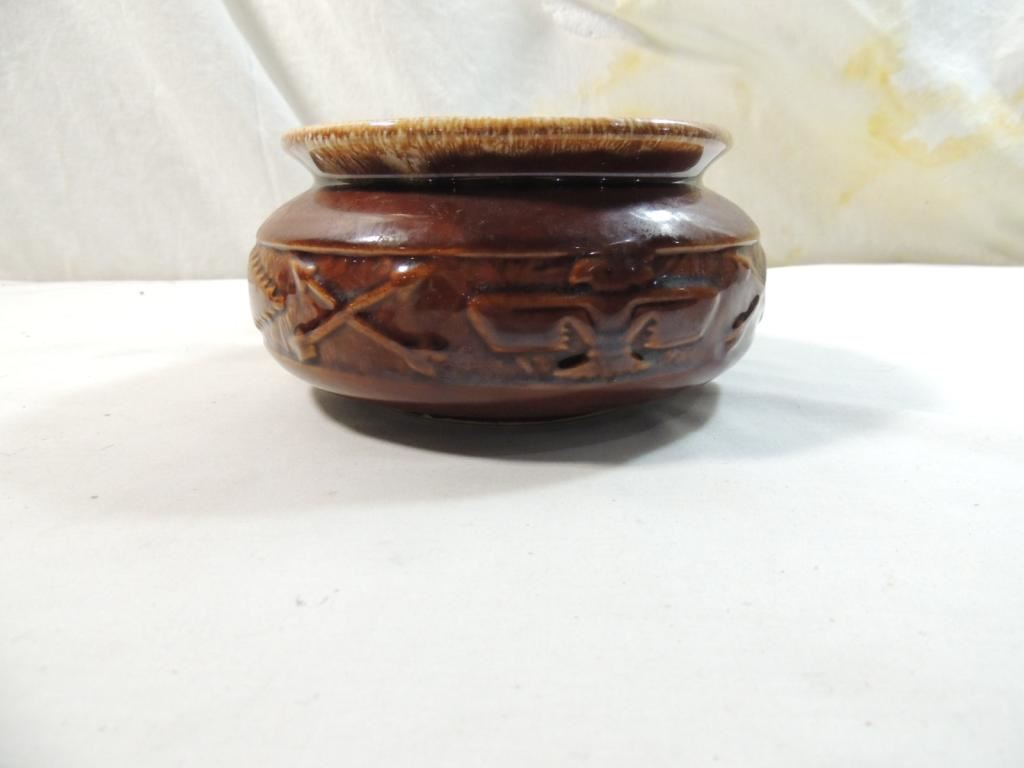 NATIVE AMERICAN, SOUTHWESTERN, VINTAGE, WESTERN, INDIAN, AMERICAN INDIAN, PLANTER, BOWL, BROWN DRIP GLAZE, ARROWS, EAGLE, MARKED COLLECTIBLE AS SHOWN SEE PHOTO FOR MORE DETAILS.