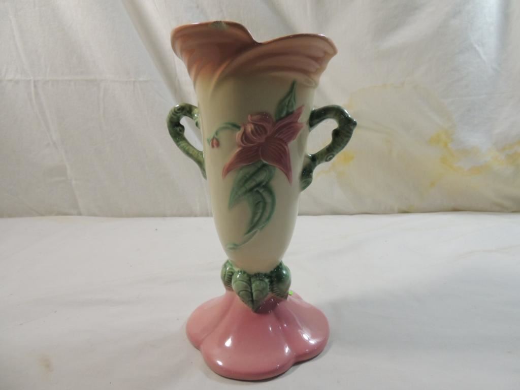 VINTAGE HULL POTTERY VASE WITH HANDLES. LEAVES DECORATIVE HULL VASE VINTAGE COLLECTIBLE. MARKED AS SHOWN SEE PHOTO FOR MORE DETAILS