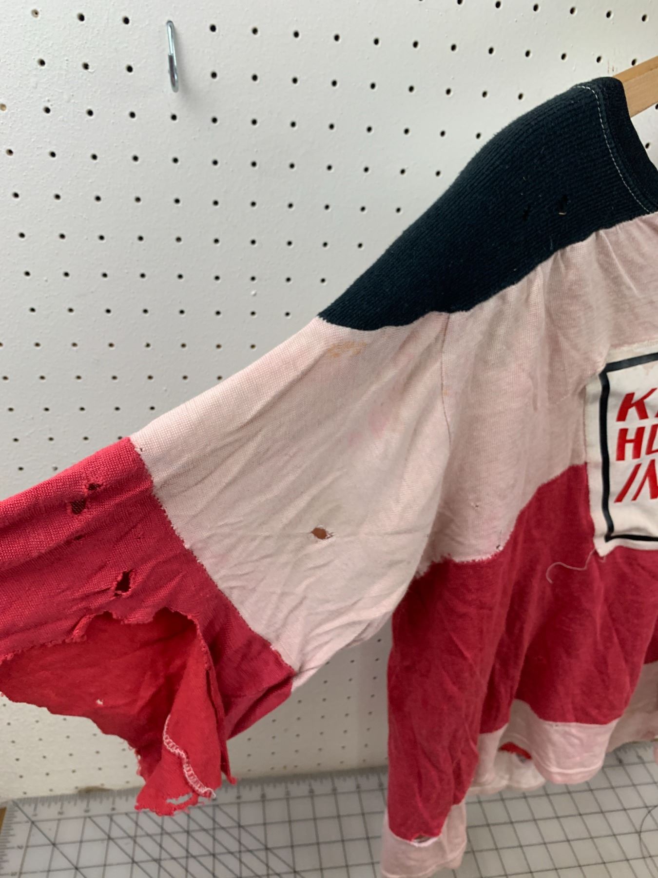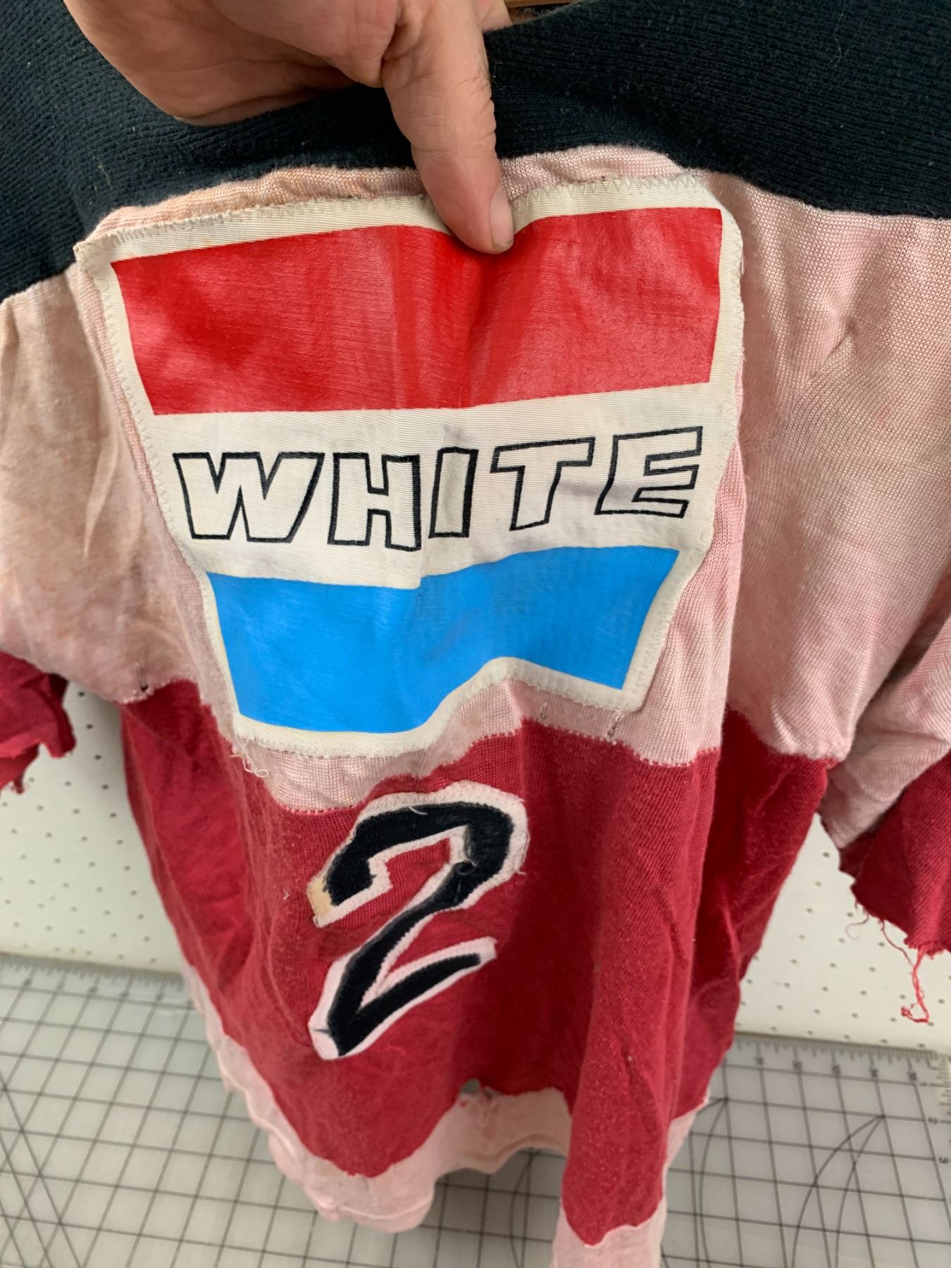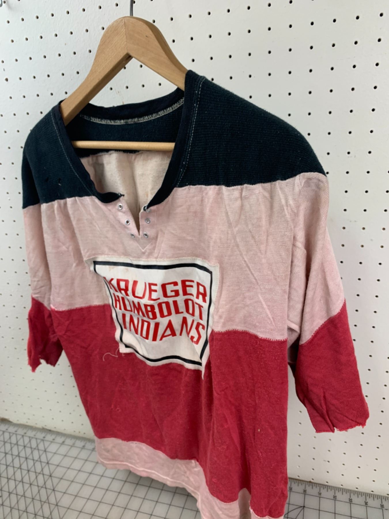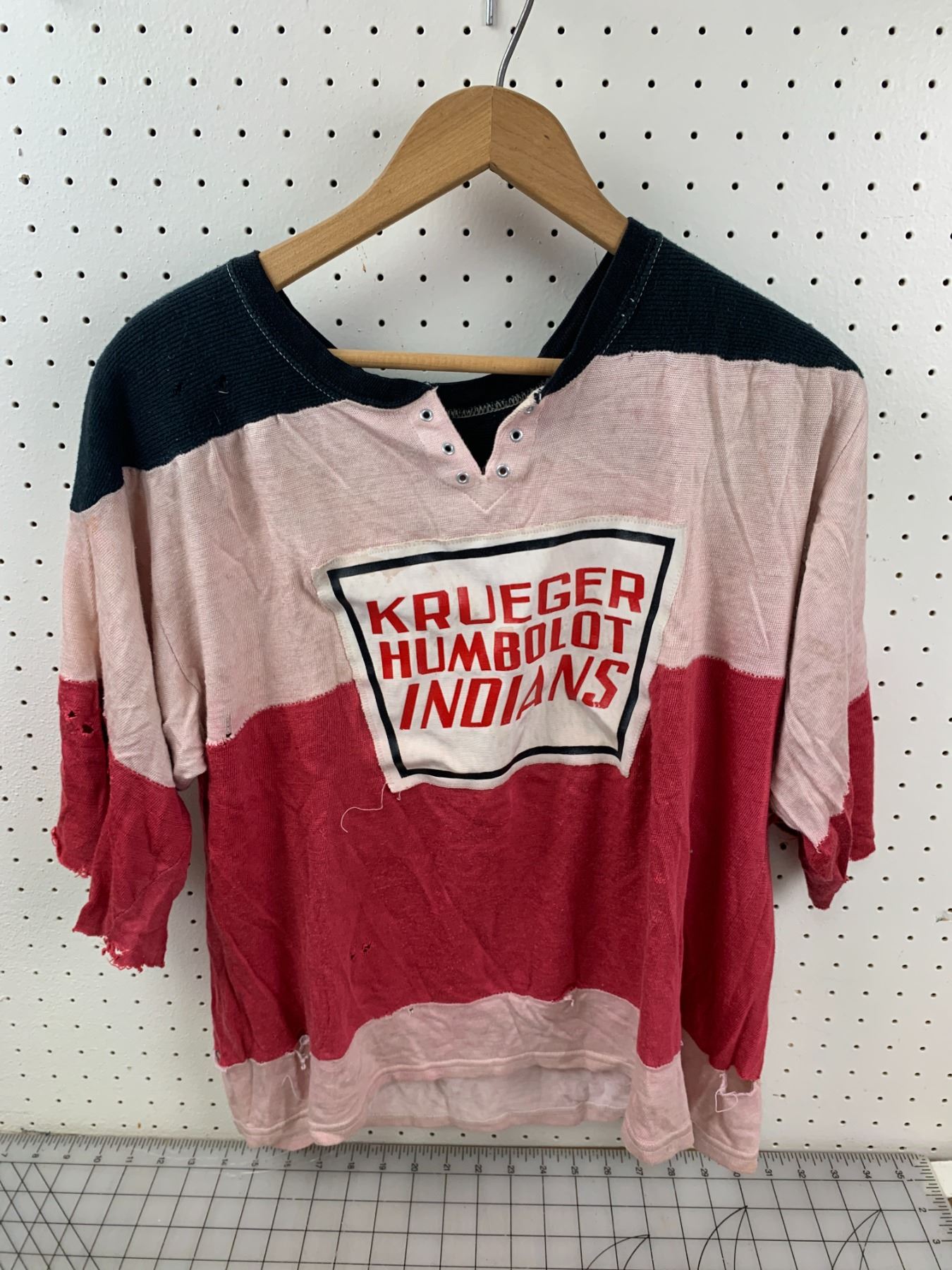 VINTAGE HUMBOLDT INDIANS HOCKEY JERSEY KRUEGER WHITE EQUIPMENT SPONSOR PATCH