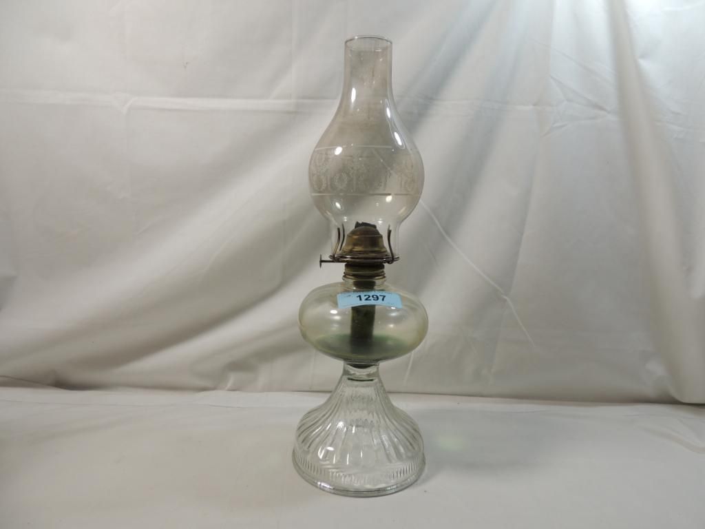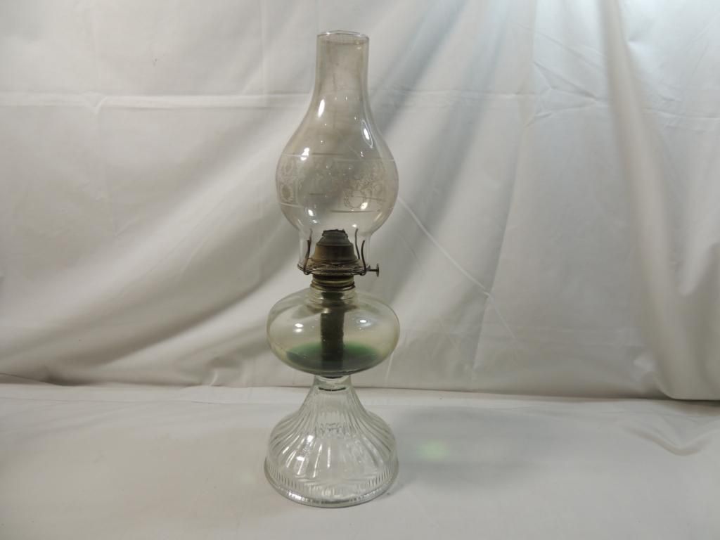 VINTAGE HURRICANE OIL LAMP. GLASS CLEAR BASE. AS SHOWN. SEE PHOTO FOR MORE DETAILS.