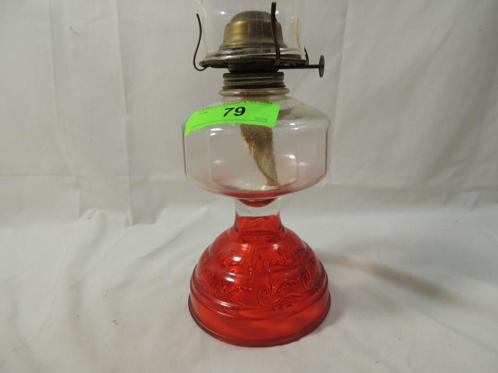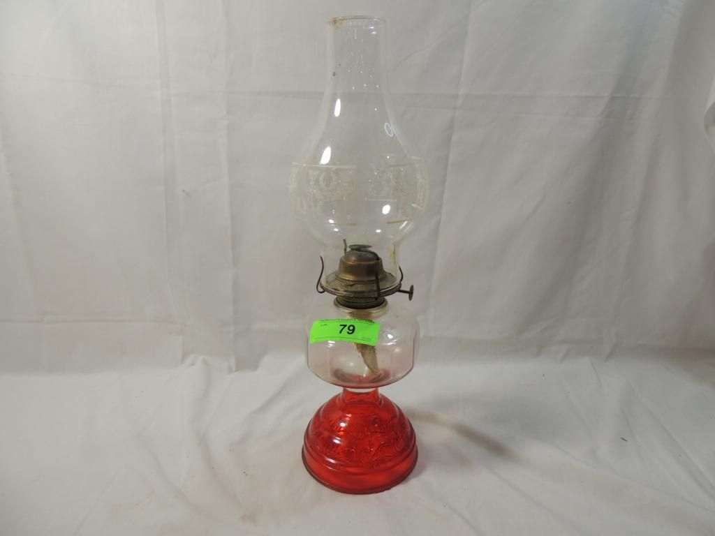 VINTAGE HURRICANE OIL LAMP. GLASS. RED BASE. AS SHOWN. SEE PHOTO FOR MORE DETAILS.