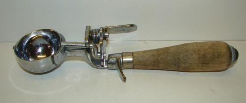 VINTAGE ICE CREAM SCOOP. Wooden handle. Bottom of thumb unit is marked "Benedict/Indestructo". Reverse of thumb unit is marked "30 to a quart". No mark on separator. 8.75" L