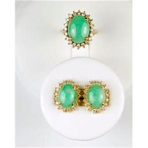 This Ring and Earring IMPERIAL JADE Suite came to us from a VERY FINE ESTATE. The ring is 14k Yellow Gold and it features an Oval IMPERIAL JADE = 5 CARATS! It is surrounded by 20 FINE DIAMONDS = .40 Carats. The matching Earrings are 14k Yellow Gold, and each Earring features an Oval IMPERIAL JADE = 3.50 CARATS surrounded by 16 FINE DIAMONDS. The IMPERIAL JADE TOTAL WEIGHT = 7.00 CARATS! And the DIAMOND Total Weight = .50 CARATS! The Earrings have Gold post style backs for pierced ears. IMPERIAL JADE refers to Jadeite found in Burma, and it is considered the rarest and most highly prized of all the Jades.