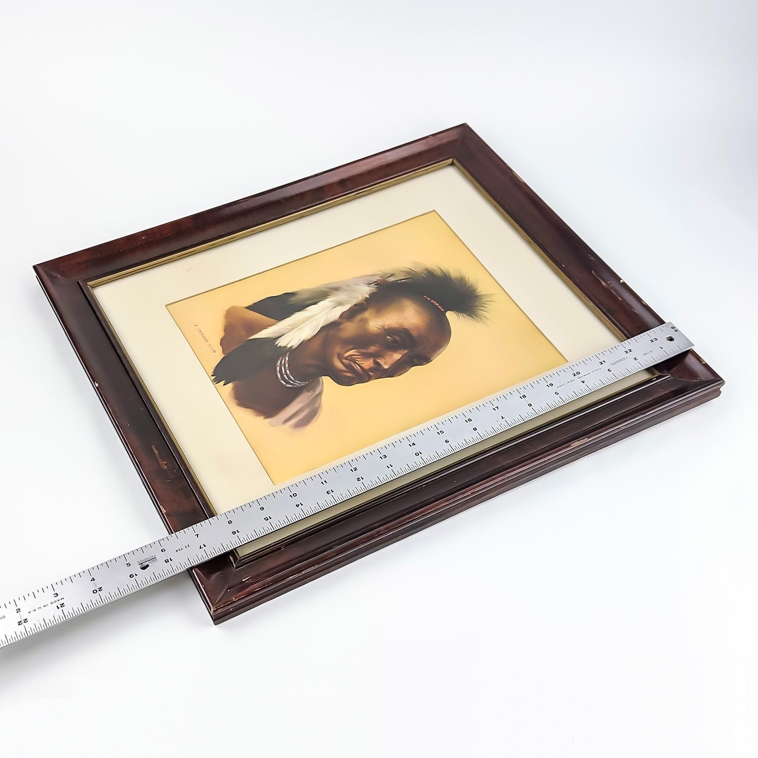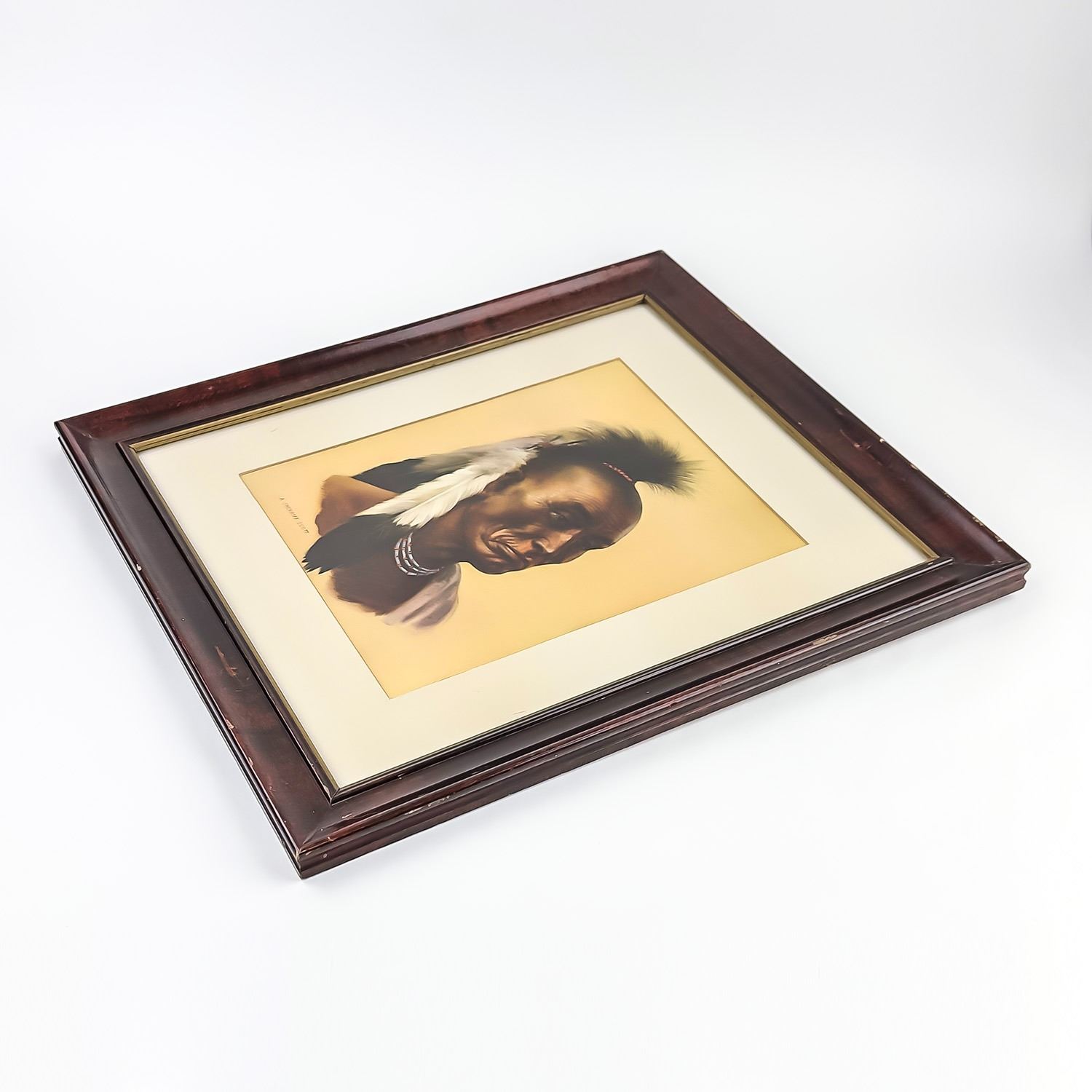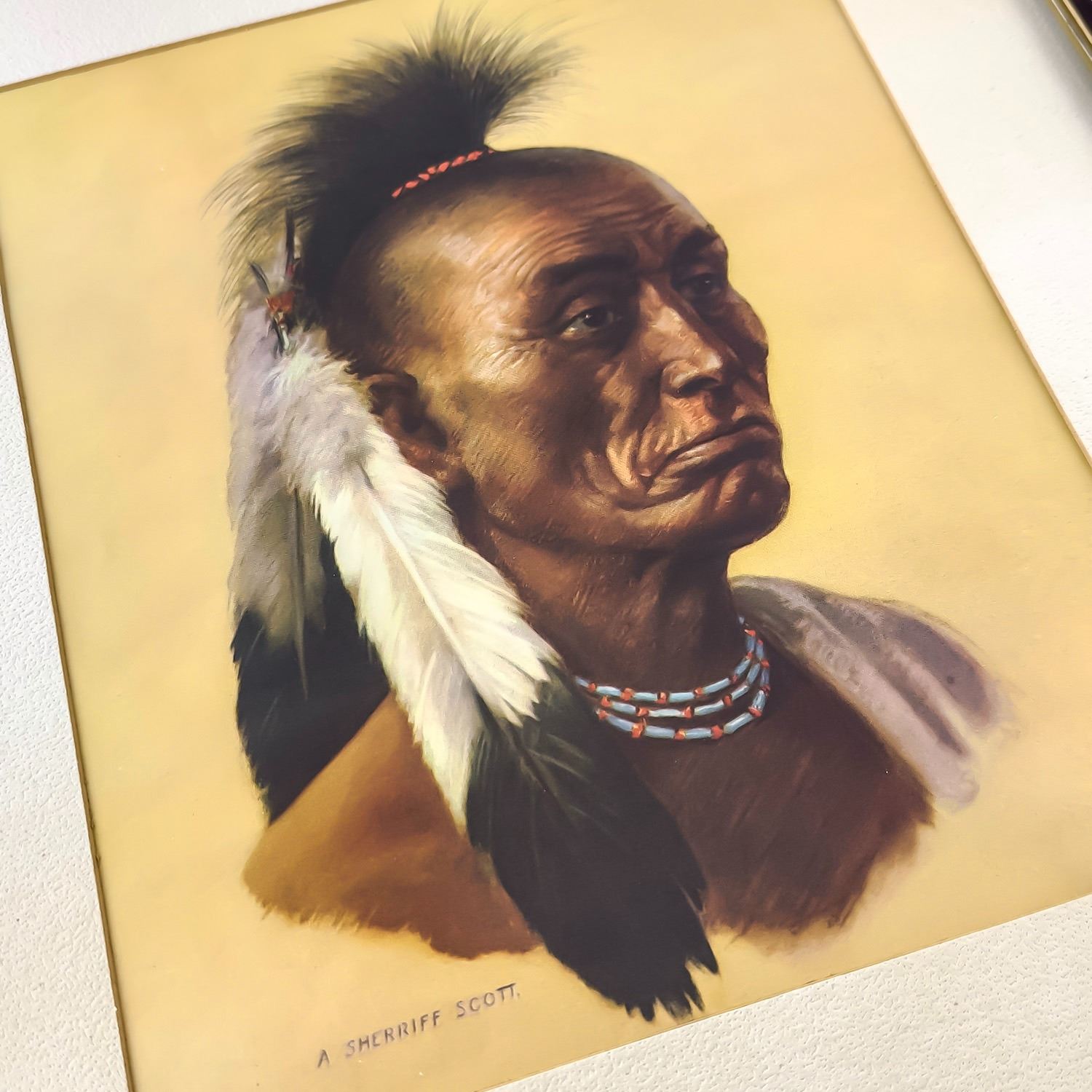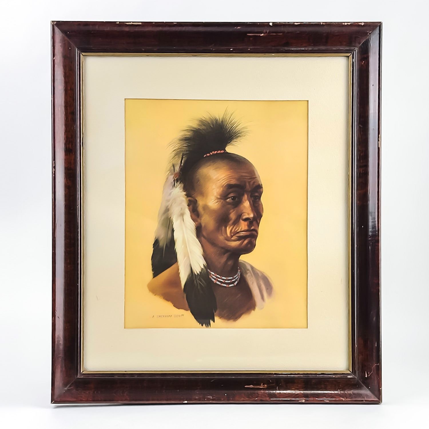 #8346 - VINTAGE INDIAN BRAVE PORTRAIT BY ADAM SHERRIFF SCOTT (1887-1980). ADAM SHERRIFF SCOTT WAS A PROMINENT CANADIAN ARTIST KNOWN FOR HIS TRADITIONAL PORTRAITS AND HISTORICAL SCENES, PARTICULARLY THOSE DEPICTING INDIGENOUS PEOPLE AND THE INUIT. HOME OR OFFICE WALL DECOR WITH WOOD FRAME AND UNDER GLASS. MEASURMENT WITH FRAME 17.5” (44.5 CM) TALL BY 15.5” (39.5 CM) WIDE.