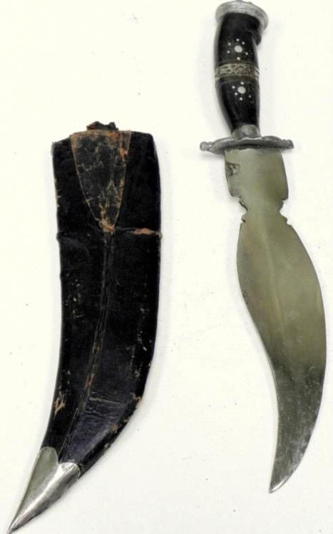 OFFERED HERE IS A VINTAGE INDIAN GHURKA KNIFE & SCABBARD-HAND ETCHED BLADE. THERE IS AN UNIQUE SHAPE TO ETCHED BLADE-8 1/2" BLADE--DECORATED GRIP-LIONS HEAD POMMEL--LEATHER COVERED WOOD BASE SCABBARD.