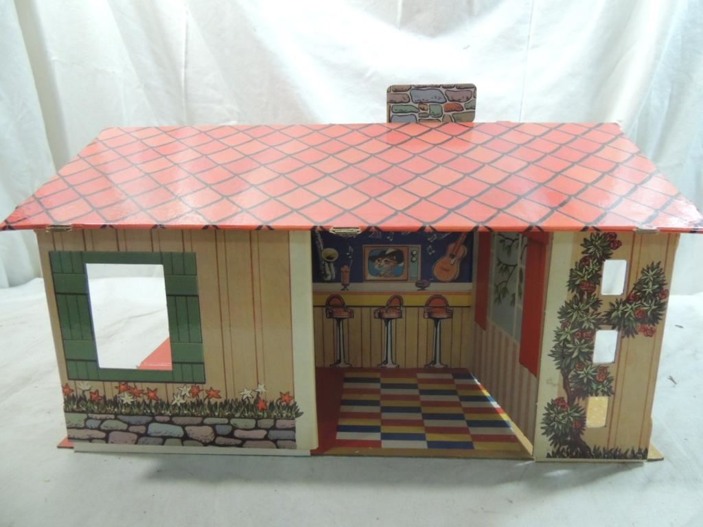 WINTHROP TOY VINTAGE INSTANT DOLLHOUSE, PLASTIC COATED CARDBOARD DOLLHOUSE FOLDS FLAT AS SHOWN SEE PHOTO FOR MORE DETAILS.