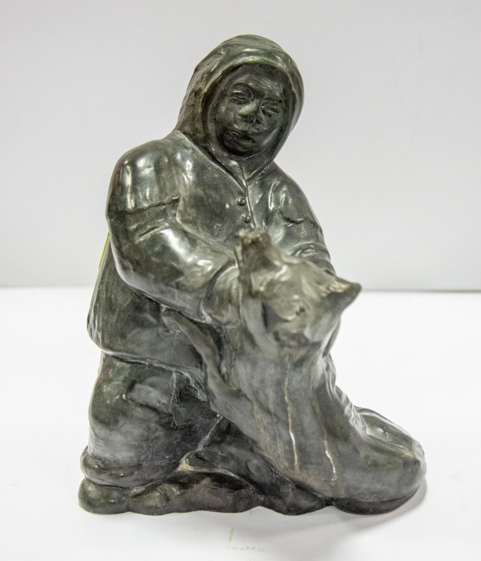 VINTAGE INUIT MAN AND HIS DOG SOAPSTONE SCULPTURE
