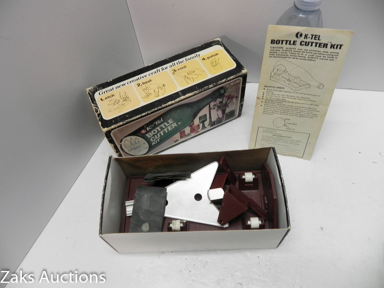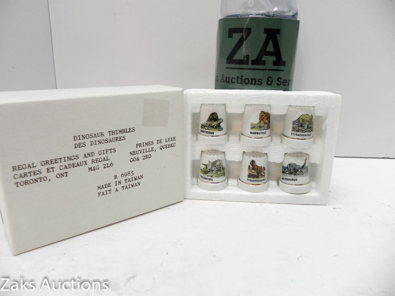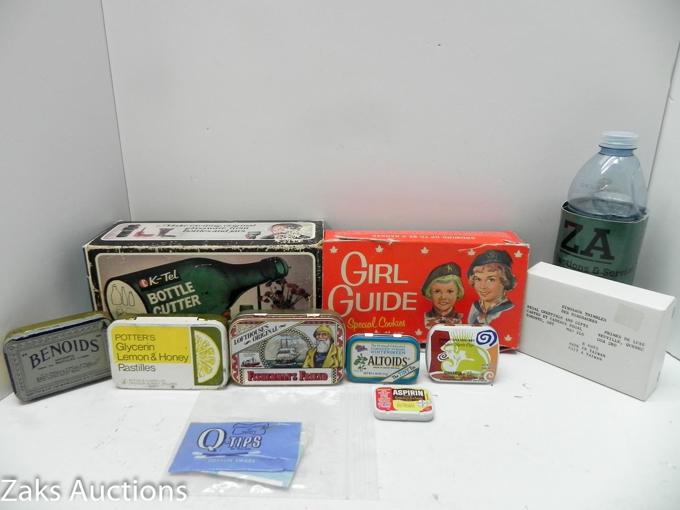 & OTHERS W/GIRLGUIDE COOKIE BOX WITH SCARF IN BOX, REGAL DINOSAUR THIMBLES IN ORIGINAL BOX & K-TEL BOTTLE CUTTER KIT