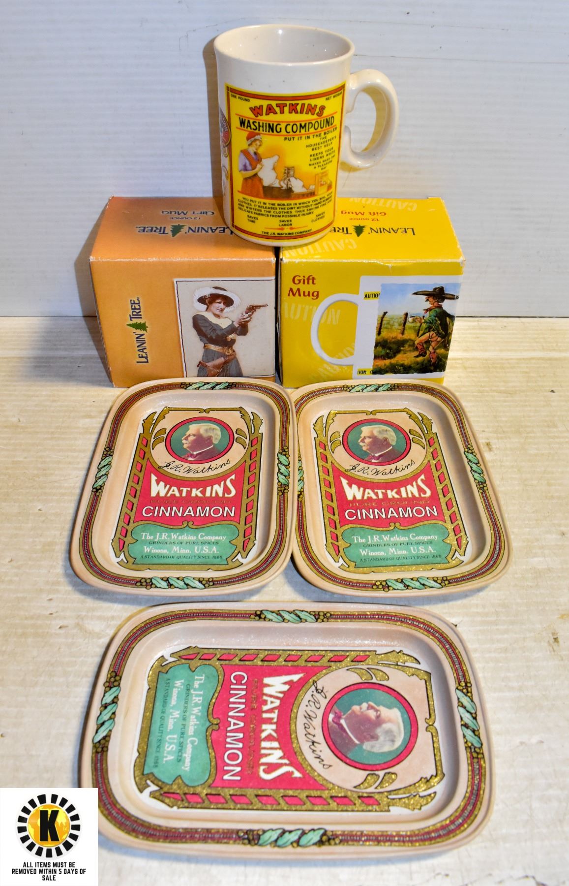 (2) COFFEE MUGS WESTERN #56116 & 56052 W/WATKINS COFFEE/TEA MUG (UNUSED) & 3 WATKINS HERITAGE MINI TRAYS