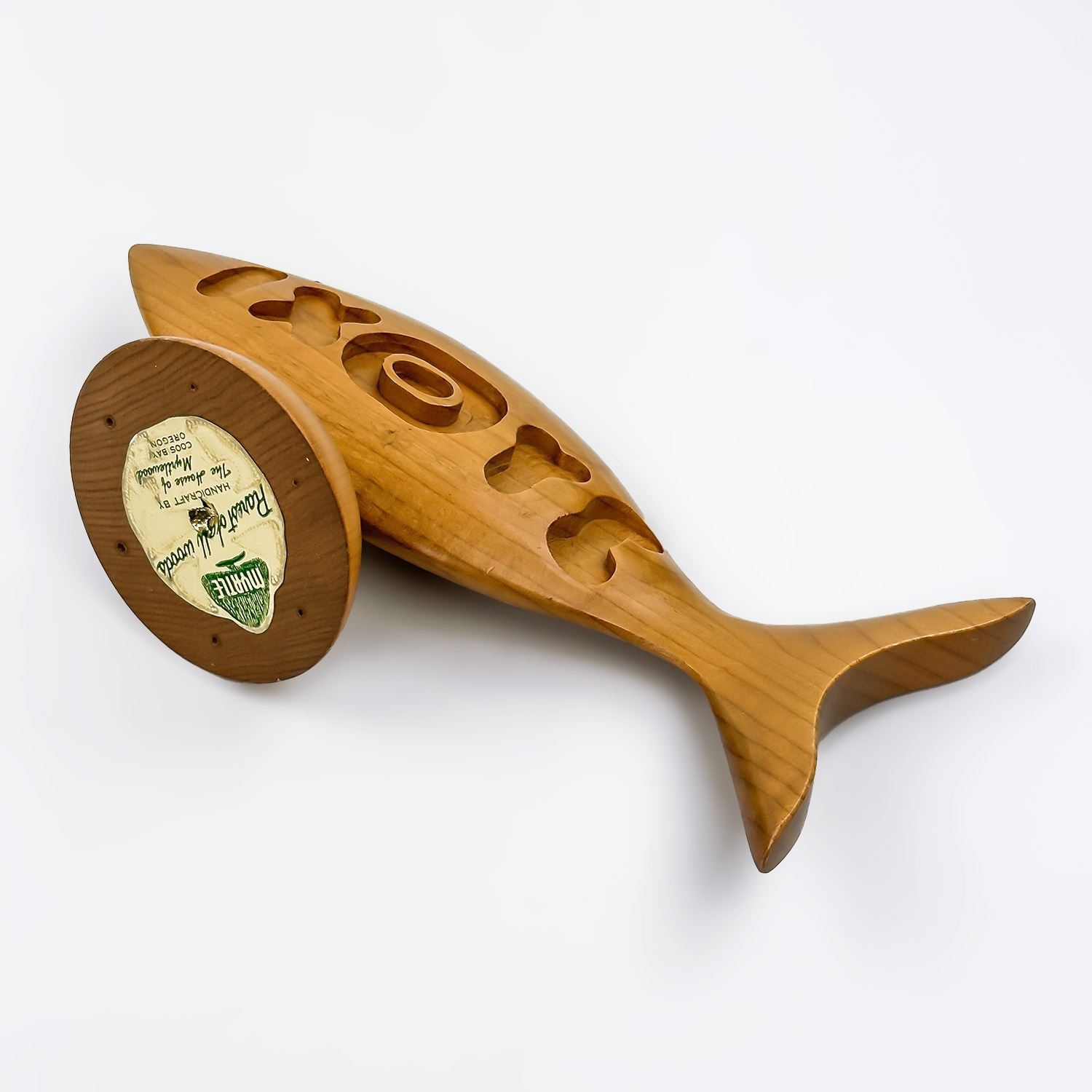 #8859 - HAND CRAFTED FROM MYRTLE WOOD. CHRISTIAN IXOYE FISH SYMBOL WOOD CARVING. HANDICRAFT BY THE HOUSE OF MYRTLEWOOD - COOS BAY OREGON. MEASURES: 8.75” (22 CM) LONG BY 3” (7.5 CM) DIAMETER BASE AND 4.25” (11 CM) HIGH***ITEM(S) LOCATED IN LETHBRIDGE ALBERTA. FREE TRANSPORT TO EDMONTON OFFICE AVAILABLE FOR THIS AUCTION. WORLDWIDE SHIPPING IS AVAILABLE FOR ALL ITEMS