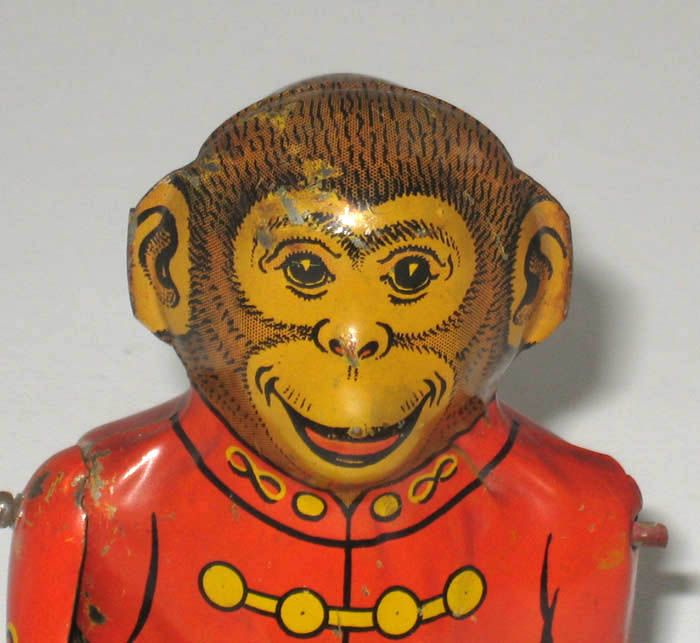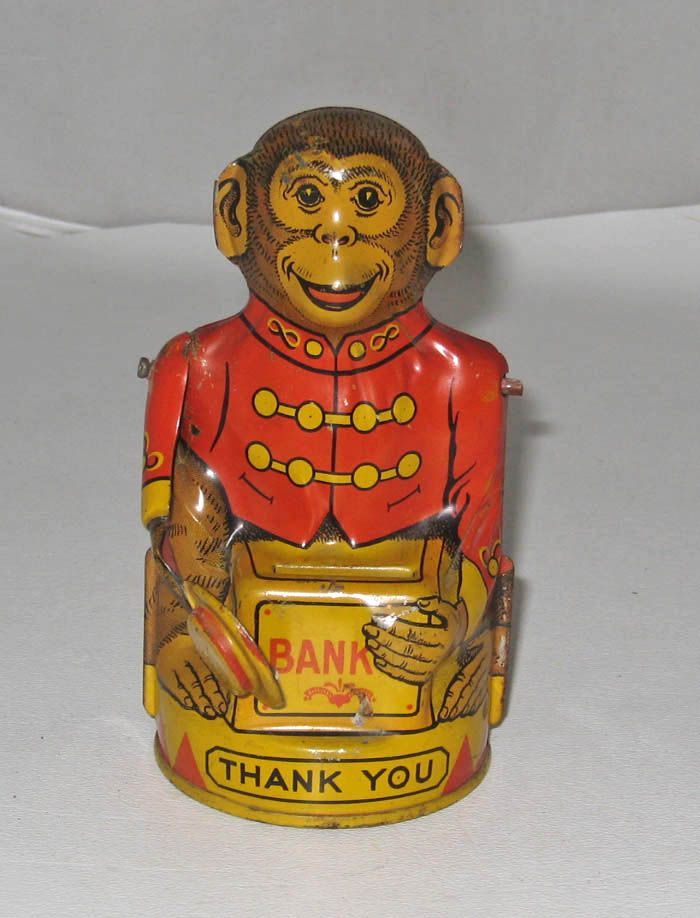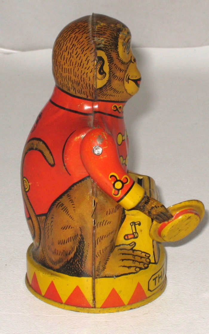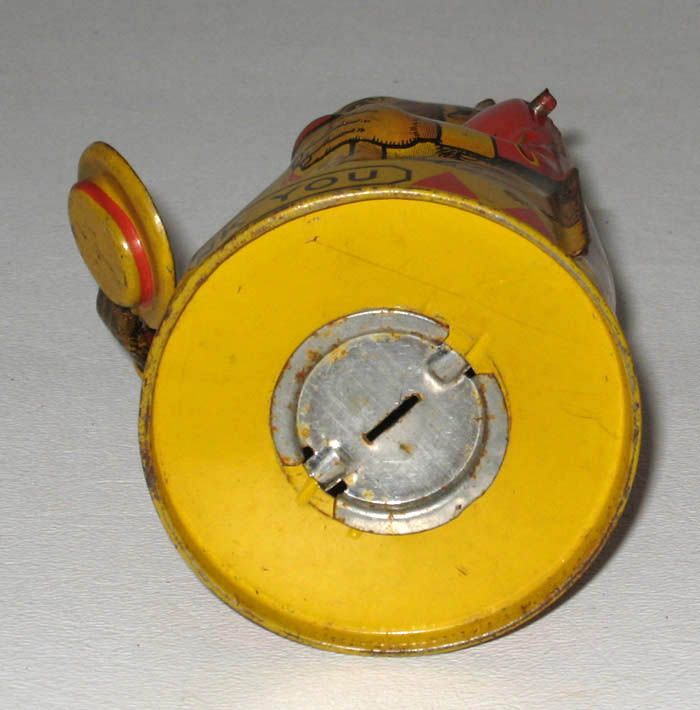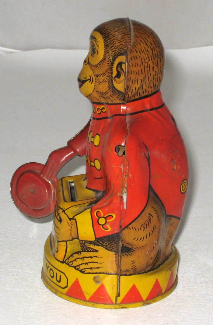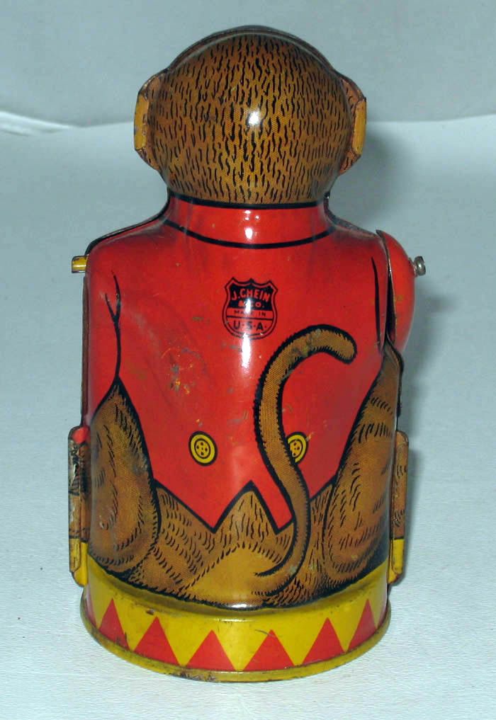 Measures approx 5" tall. Marked J.Chein & Co, Made in USA. There are some scratches and wear from age and storage. Arm with hat in hand moves.
