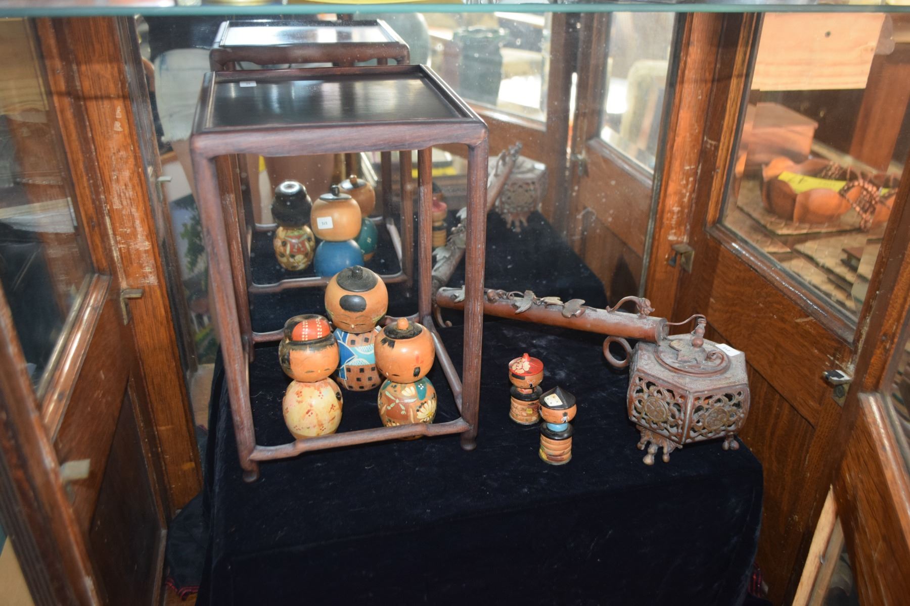 VINTAGE JAPANESE COOPER INKWELL W/PEN HOLDER, KOKESHI DOLLS & STAND (7 PCS)