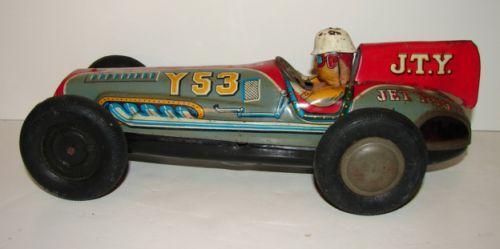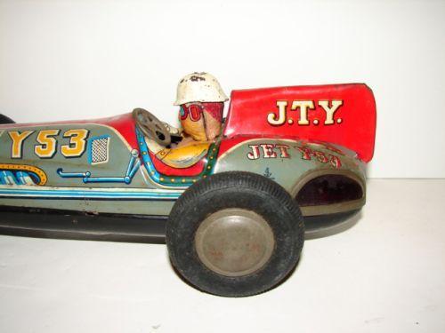 VINTAGE JAPANESE FRICTION TOY RACE CAR. Shows minor loss to paint at driver’s helmet. Rubber wheels. 11.5” L