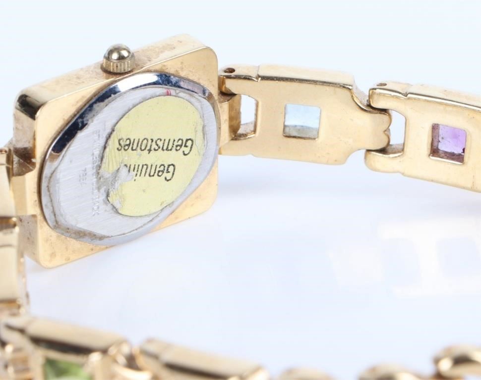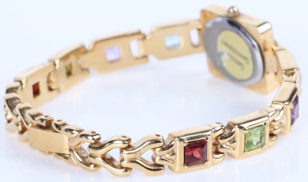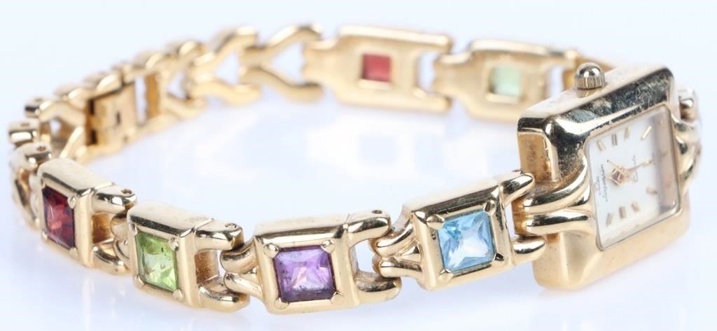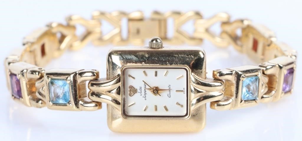 Gorgeous vintage Jules Jurgensen ladies watch Adorn with topaz, amethyst, peridot, and garnet stones. Measures 7.5"