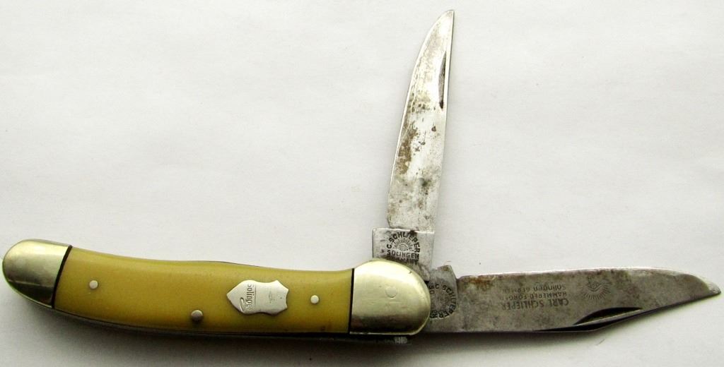 POCKET KNIFE. 2 BLADE. SOLINGEN GERMANY. HAMMER FORGED. NEEDS CLEANED UP. HAS BEEN LIGHTLY SHARPENED. LIGHT BLADE WOBBLE AND OK SNAP. MAIN BLADE IS JUST UNDER 3" LONG.