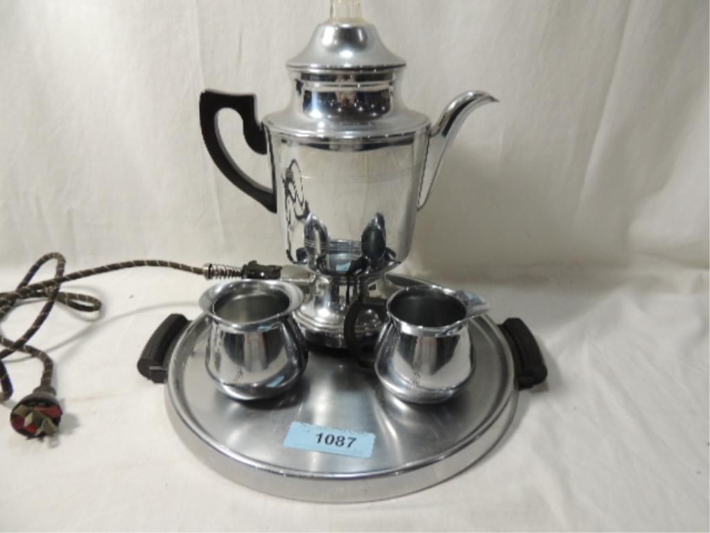 PLUG IN ELECTRIC COFFEE KETTLE SERVING TRAY, SUGAR BOWL AND CREAMER. AS SHOWN. SEE PHOTO FOR MORE DETAILS.