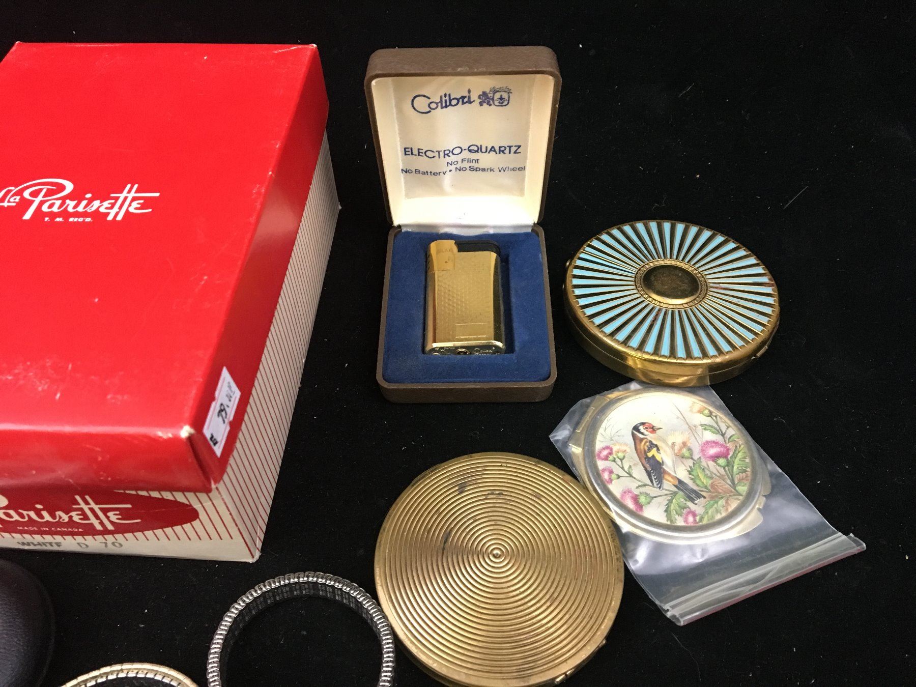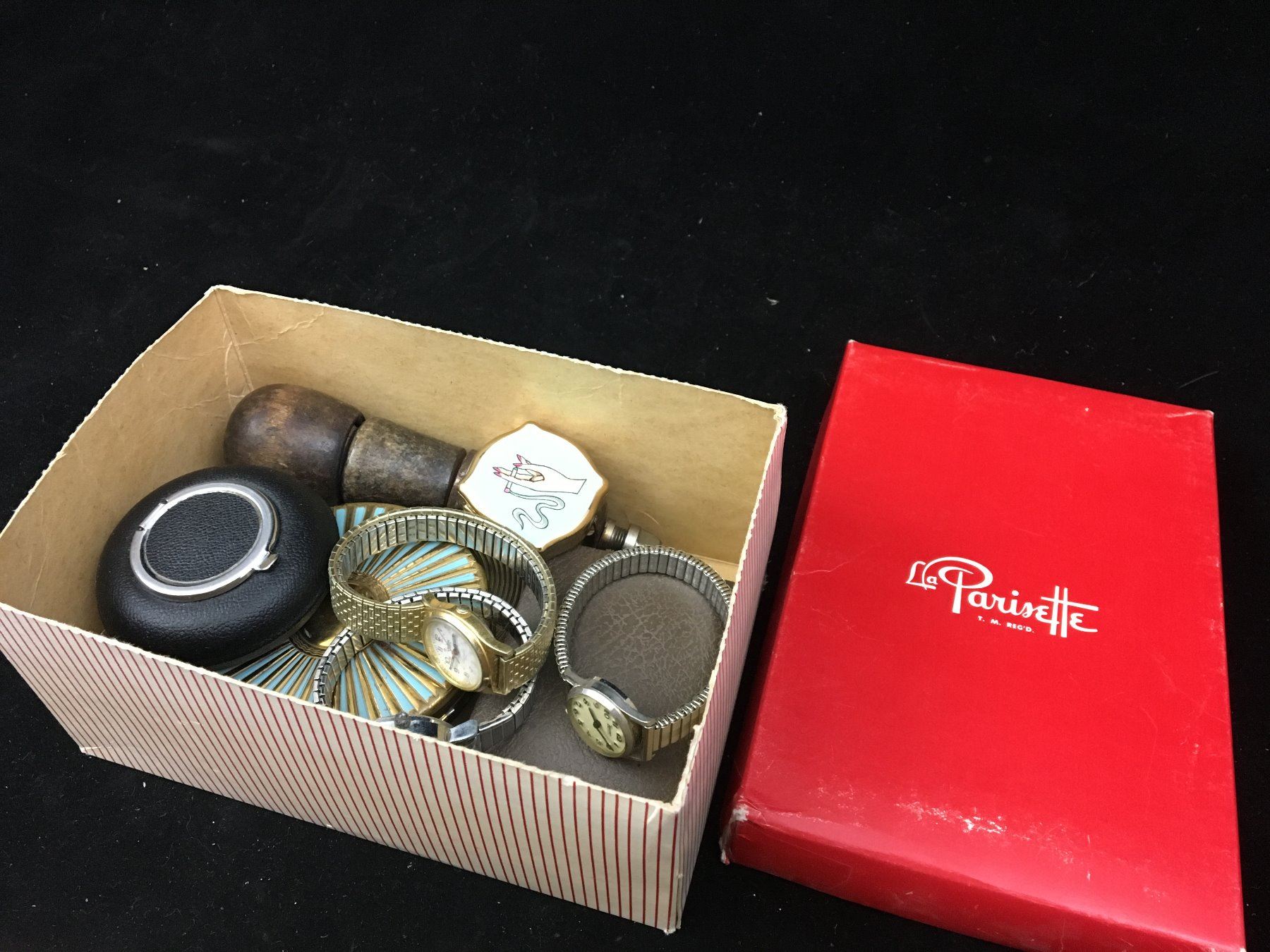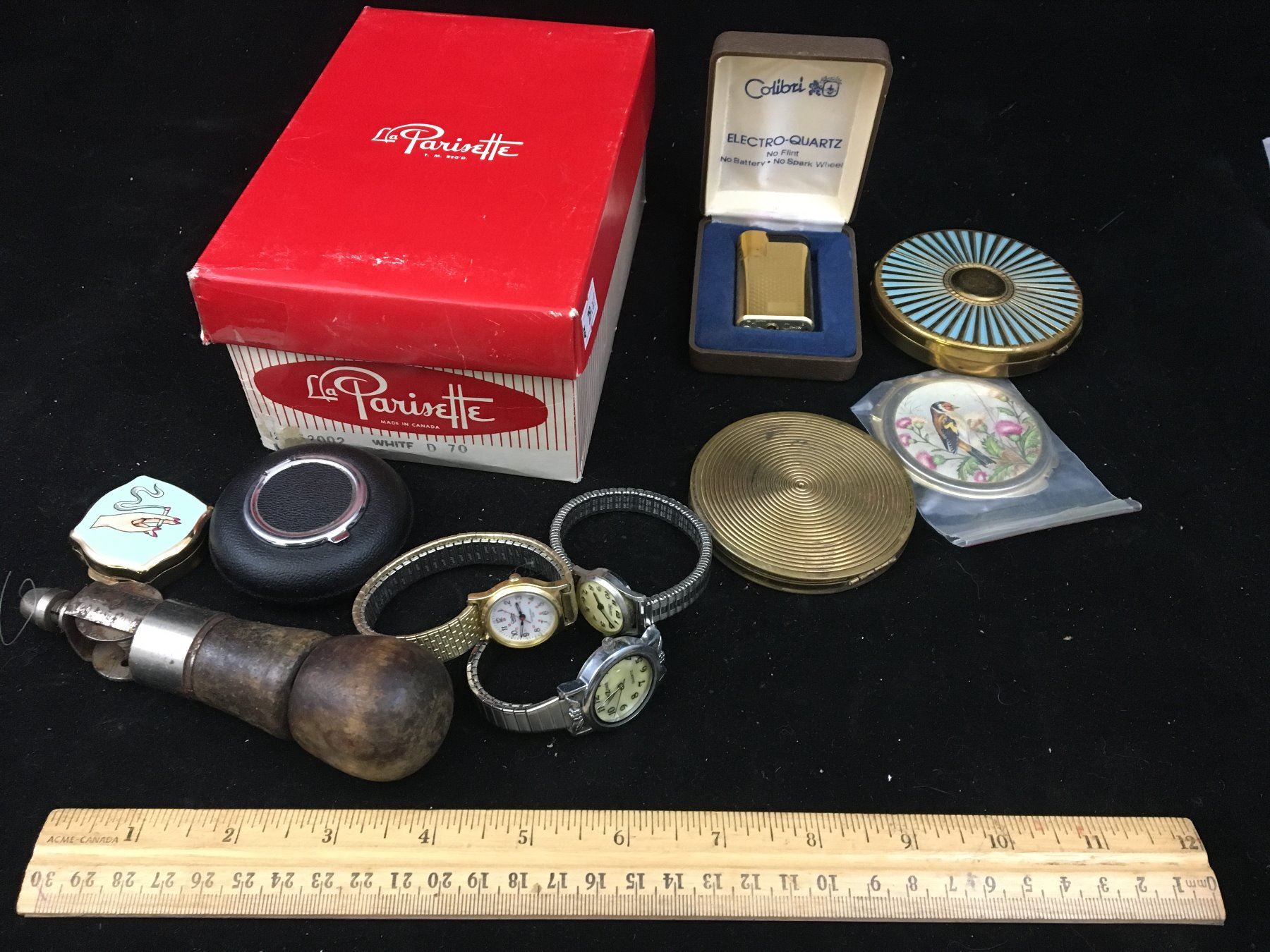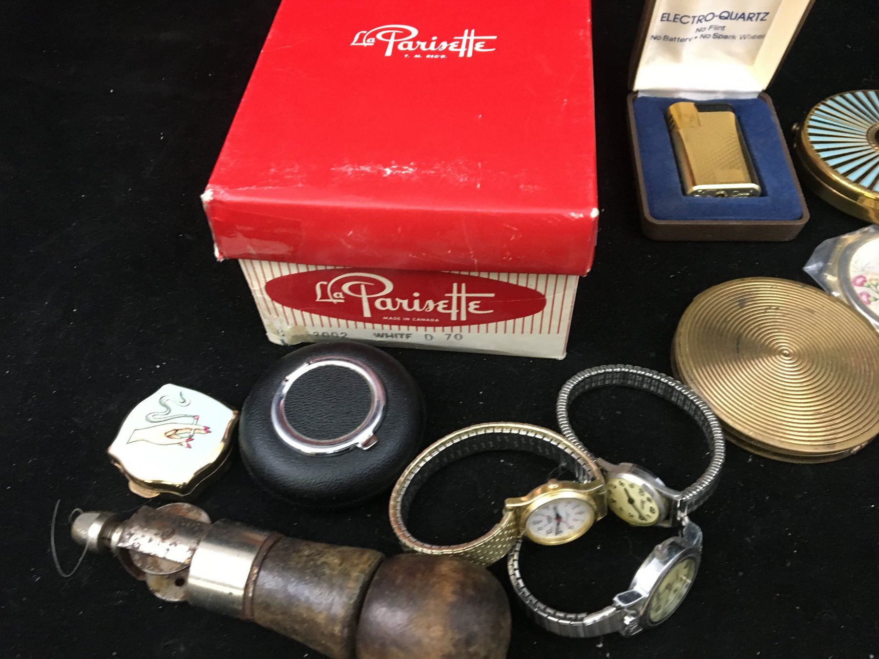 VINTAGE KIDS SHOE BOX LOT (COMPACTS WATCHES AWL POCKET ASHTRAYS LIGHTER)