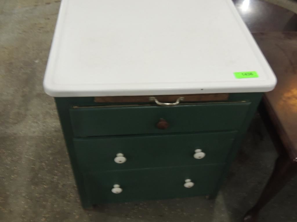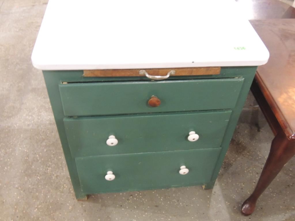 METAL TOP CABINET WITH PULL OUT CUTTING BOARD, VINTAGE CABINET, KITCHEN CABINET, RETRO CABINET AS SHOWN SEE PHOTO FOR MORE DETAILS.