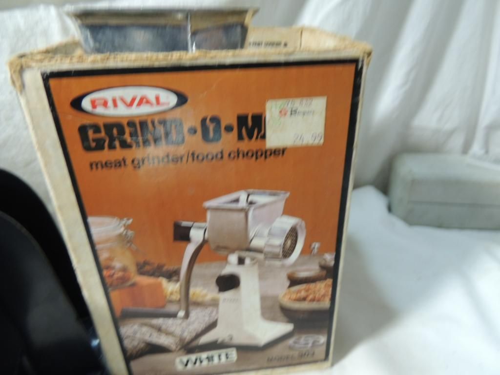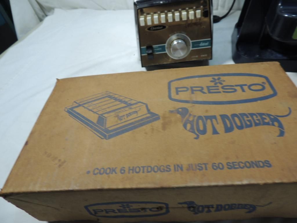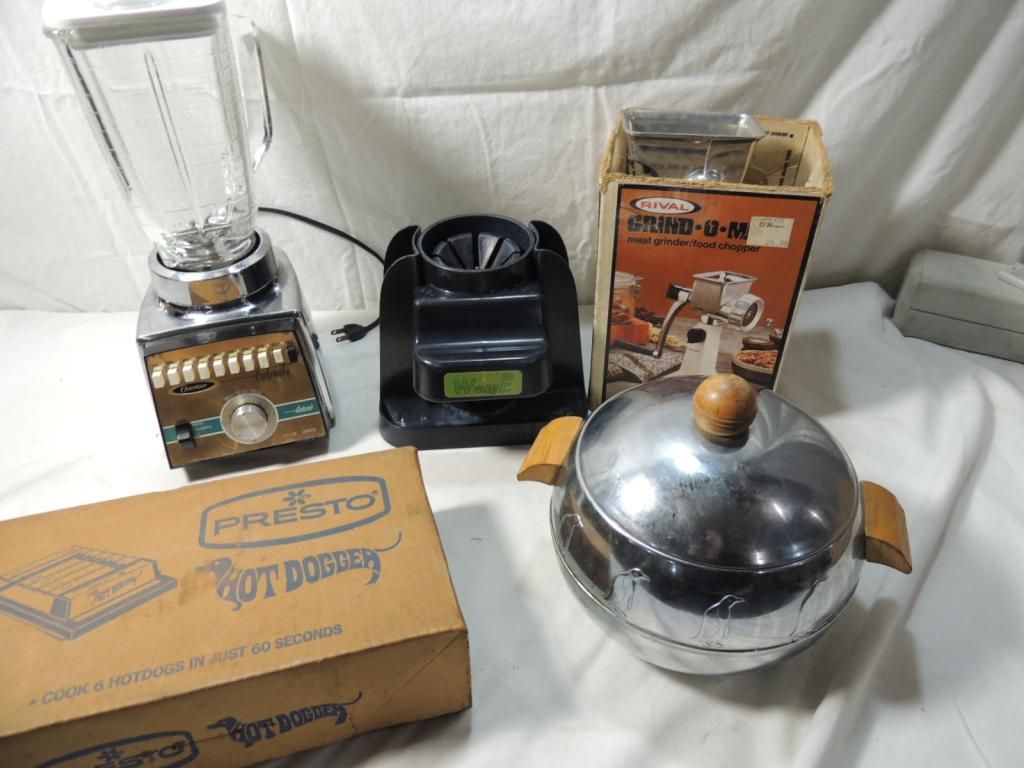 RIVAL GRIND O MAT, PRESTO HOTDOG MAKER, BLENDER, WEDGE SLICER, ICE COOLER. VINTAGE ELECTRONICS HOUSEHOLD ITEMS. AS SHOWN. SEE PHOTO FOR MORE DETAILS.