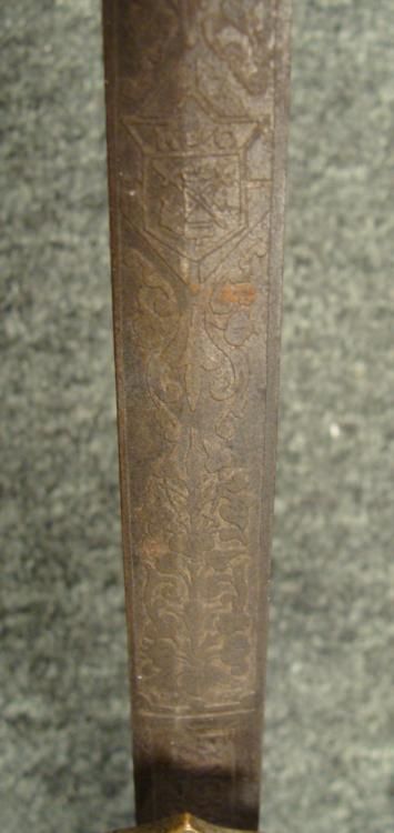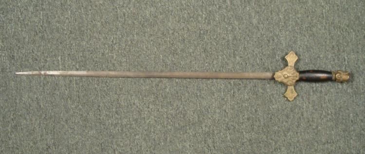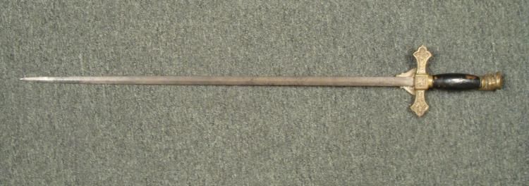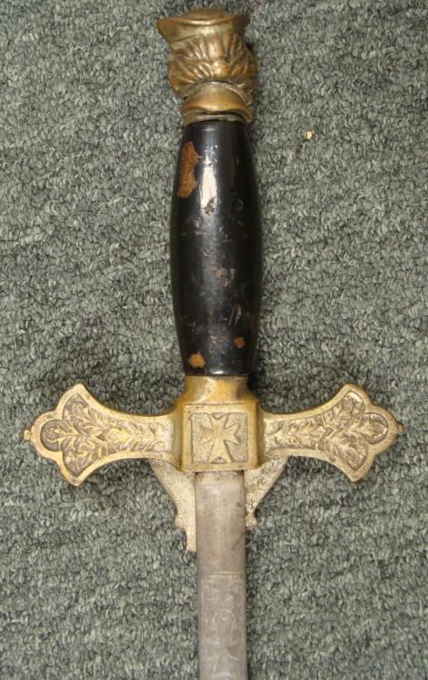 HERE IS A VINTAGE KNIGHTS OF COLUMBUS FRATERNAL SWORD. IT HAS A CHRISTOPHER COLUMBUS POMMEL AND BLACK WOOD GRIP. INTRICATELY ETCHED BLADE ON BOTH SIDES AND MAKERS MARK ON RICASSO. IT HAS A HEAVY PATINA ON BLADE; COULD BE CLEANED UP. THE SWORDS OVERALL LENGTH IS 34 1/2". *