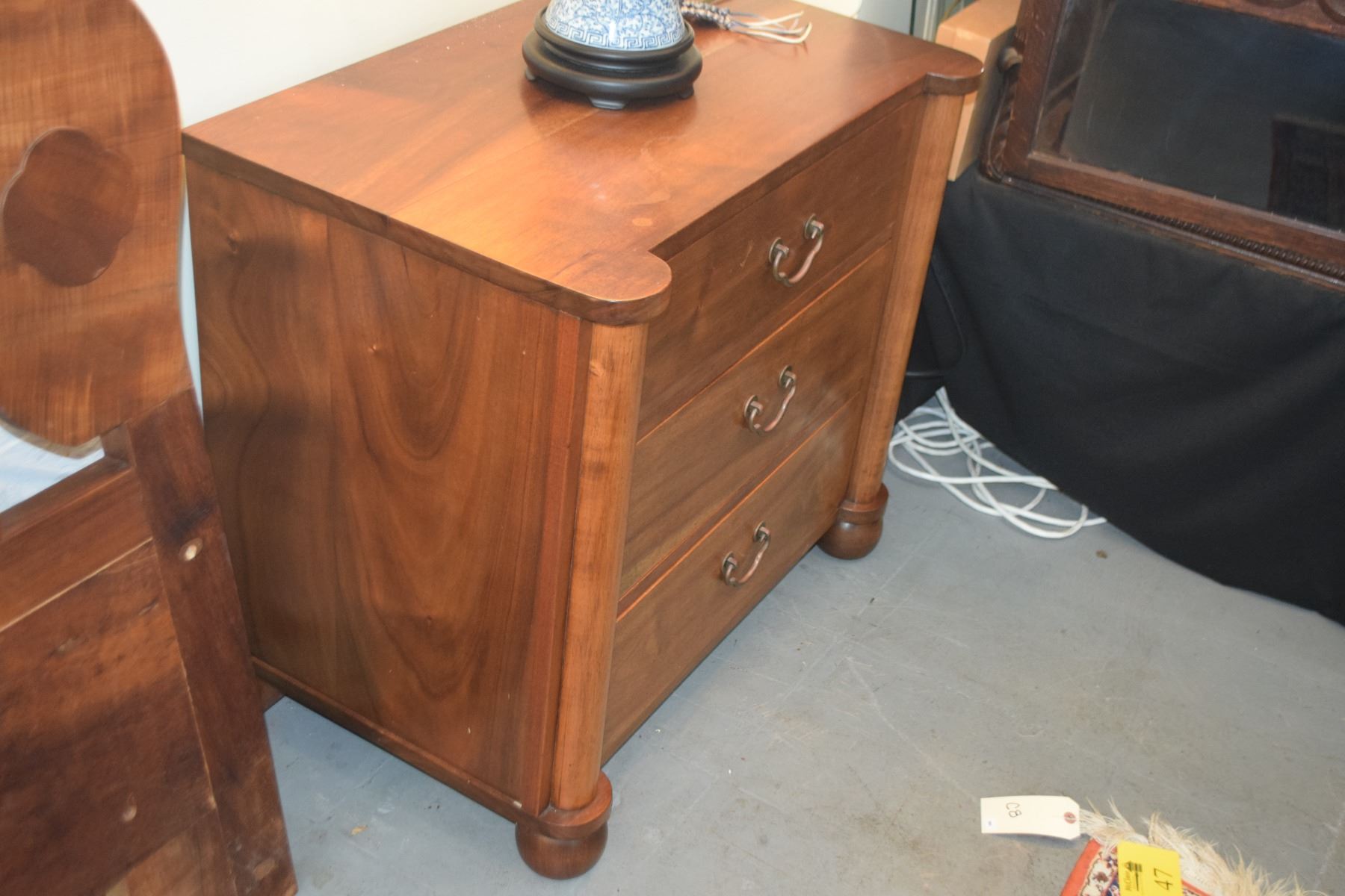 VINTAGE KOA SIDE CHESTS, EACH W/3 DRAWERS FLANKED BY PLAIN CYLINDRICAL PILASTERS, RAISED ON COMPRESSED BALL FEET, MOUNTED W/COPPER DRAWER PULLS (26 3/4" X 30" X 18 3/4") (PAIR)